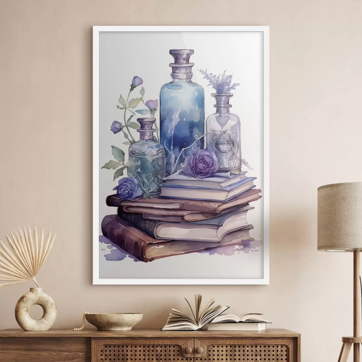 Plakatas Natiurmortas su senovinėmis knygomis, mėlynai violetinių atspalvių stiklo buteliais ir dekoratyvinėmis gėlėmis. Ne f42574