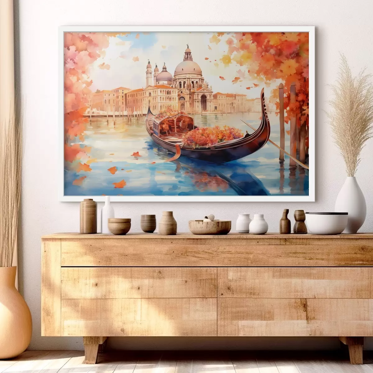 Plakatas Rudeninis Venecijos vaizdas su gondola, apsupta ryškiai oranžinių ir raudonų lapų, su pastatų atspindžiais ramiame kanalo vandenyje. f42576