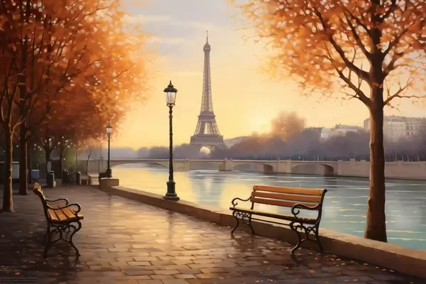 Plakatas Ruduo Paryžiuje su vaizdu į Eifelio bokštą, Senos krantais, padengtais lapais, suoliukais ir gatvių žibintais, kurie prisideda prie romantiškos atmosferos f42577