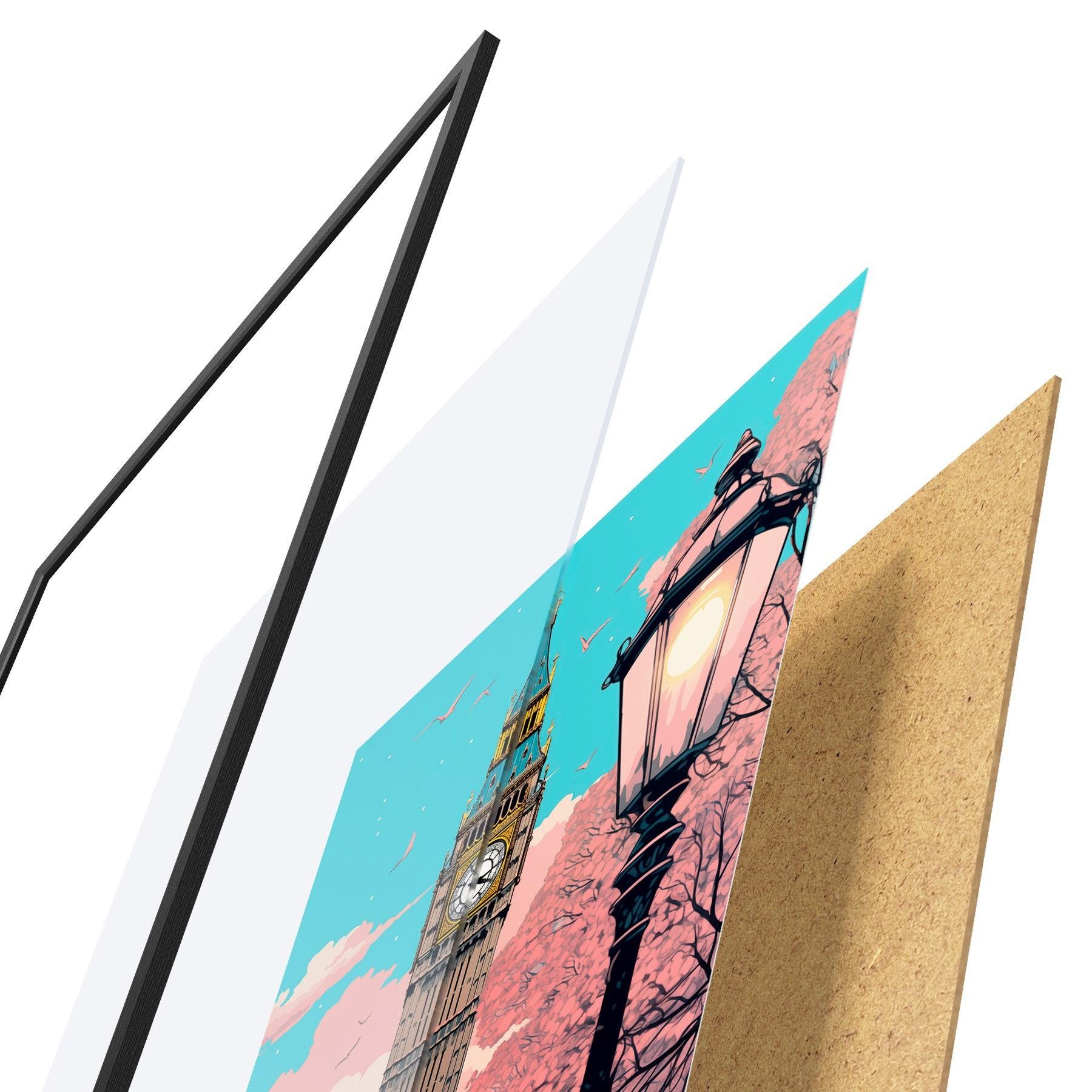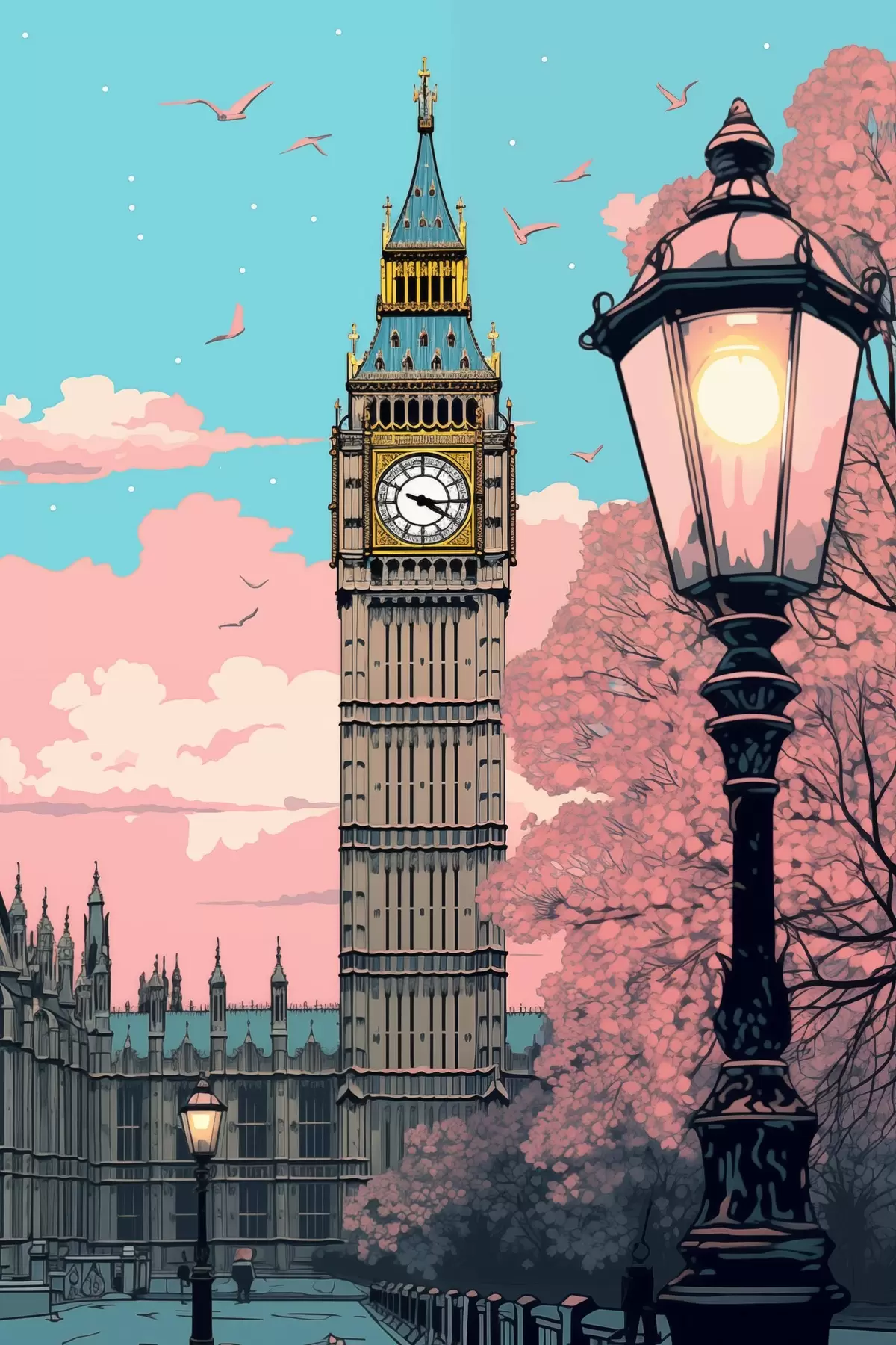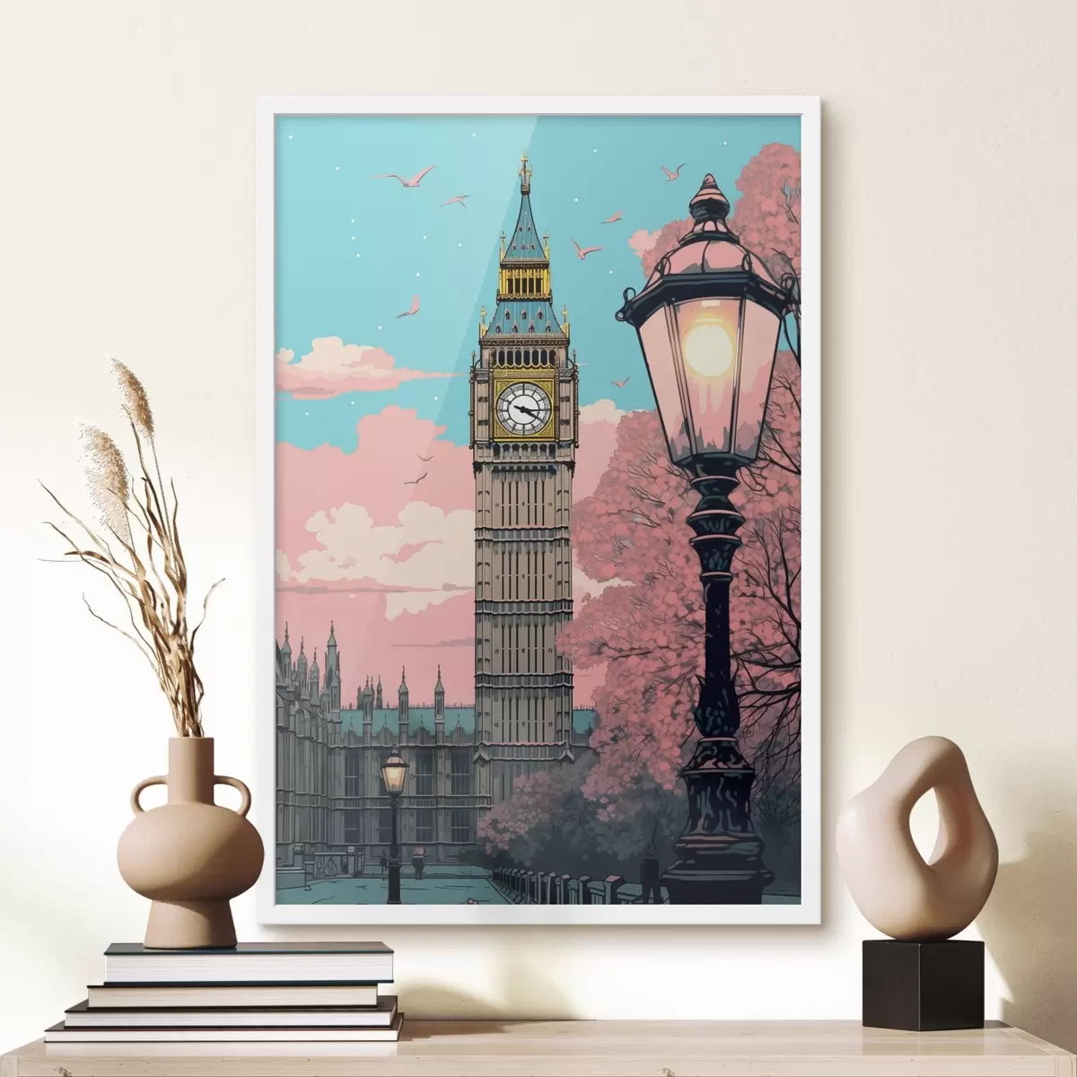 Plakatas Big Beno vaizdas su pavasariškai rausvais medžiais, ryškiai mėlynu dangumi ir senoviniu gatvės žibintu pirmame plane. f42578
