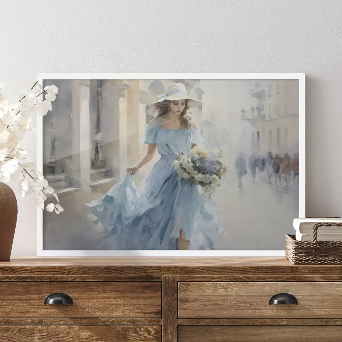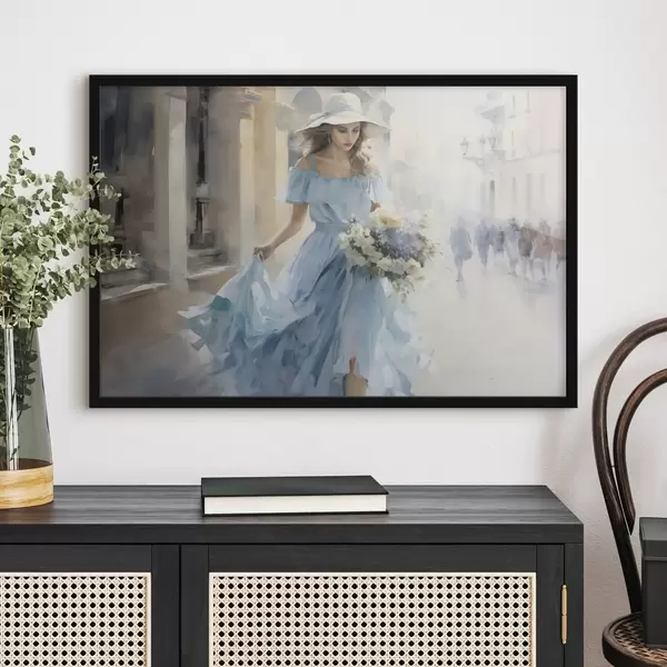 Plakatas Elegantiška mergina su šviesiai mėlyna suknele ir skrybėlaite vaikšto po miestą, laikydama gėlių puokštę, lengva ir romantiška nuotaika. f42580