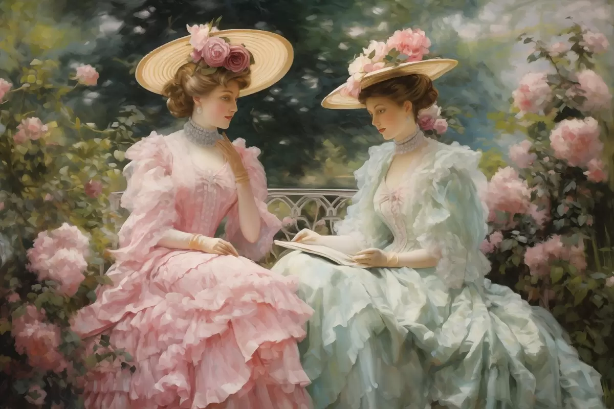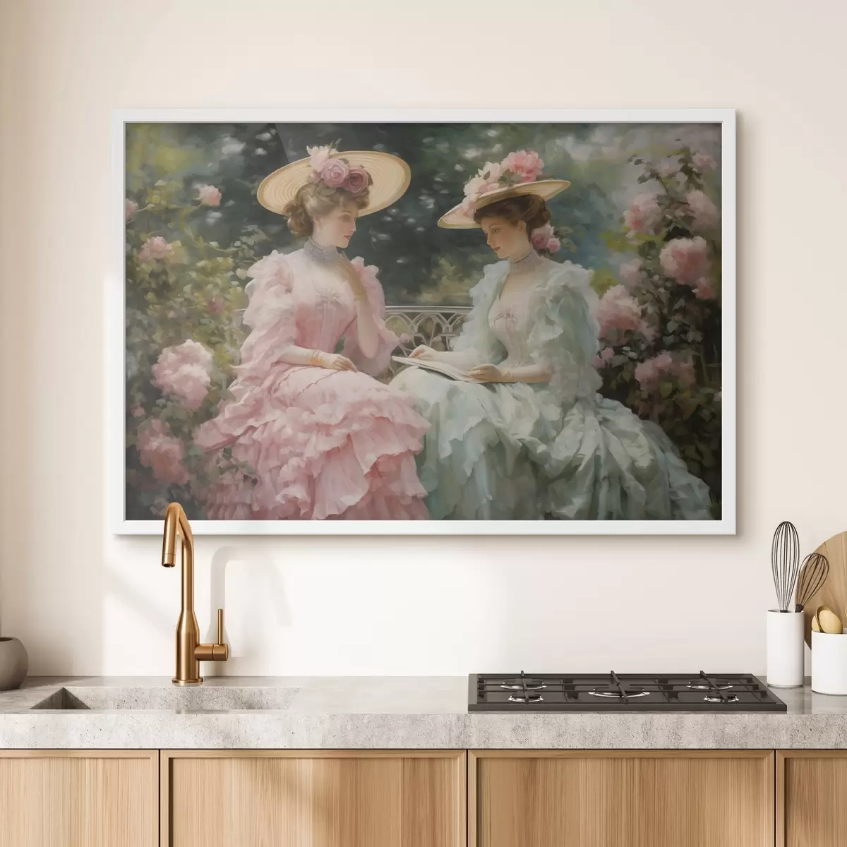 Plakatas Dvi elegantiškos moterys pastelinėmis suknelėmis sėdi sode tarp rožių, skaito knygą ir mėgaujasi ramia atmosfera. f42582