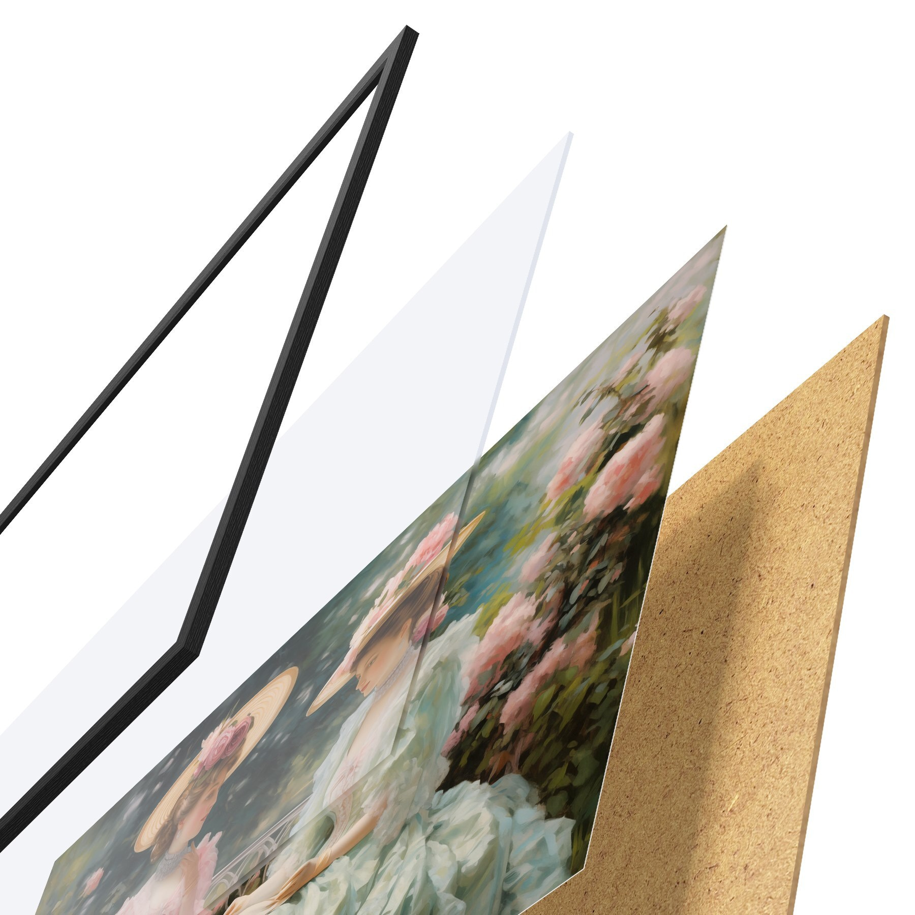 Plakatas Dvi elegantiškos moterys pastelinėmis suknelėmis sėdi sode tarp rožių, skaito knygą ir mėgaujasi ramia atmosfera. Ne f42582