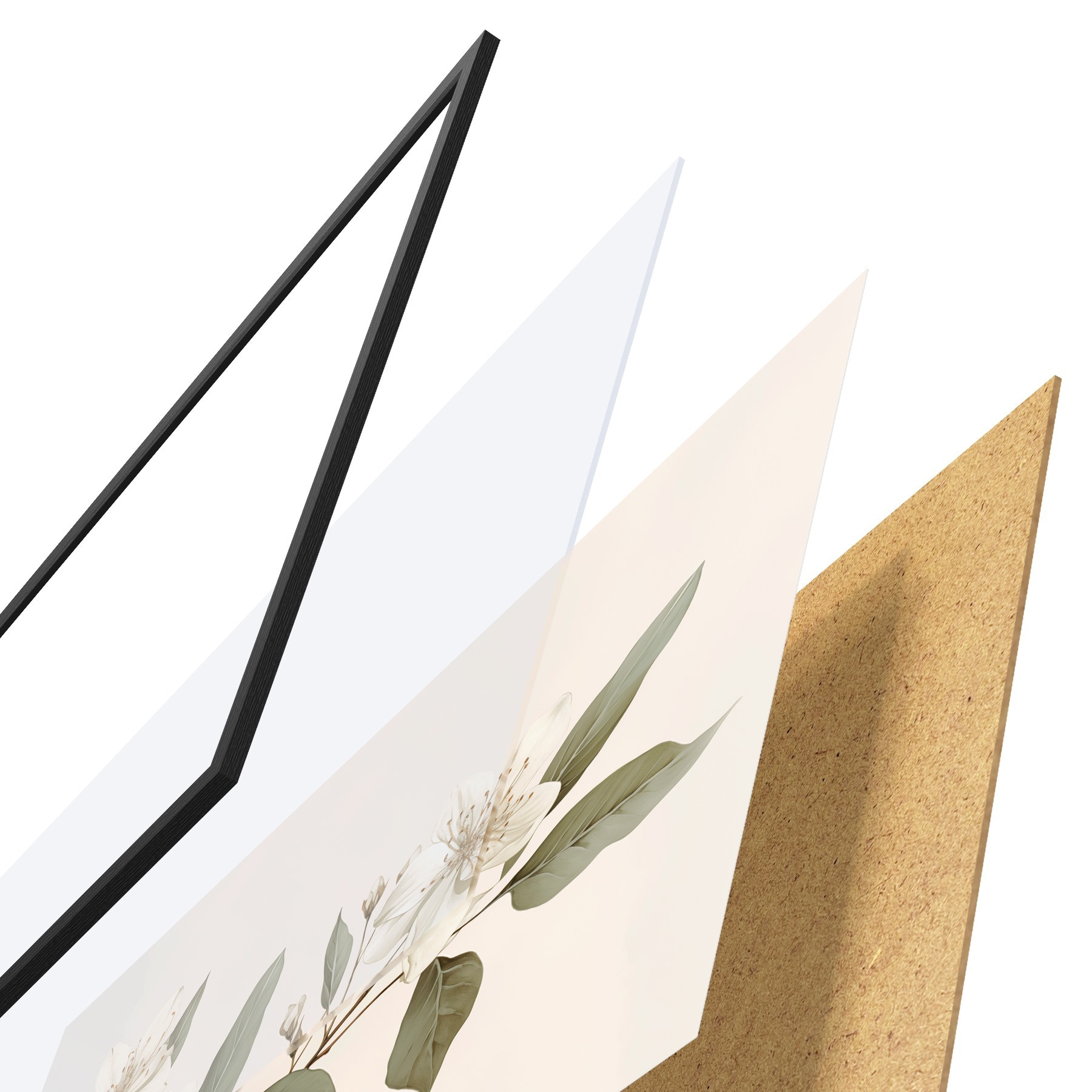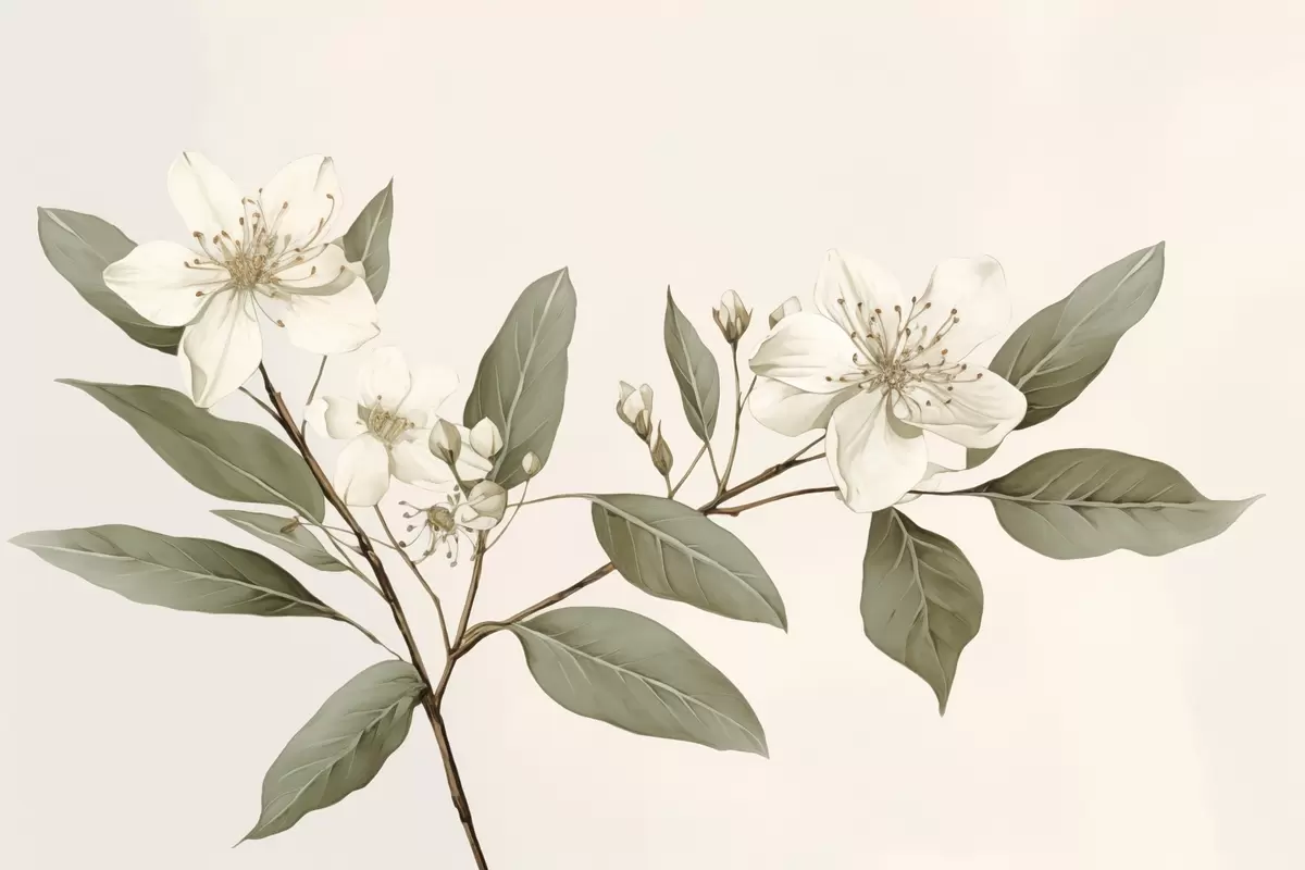 Plakatas Švelni šakelė su baltomis gėlėmis ir žaliais lapais šviesiame fone, su švelniomis detalėmis ir elegantišku stiliumi. Ne f42583