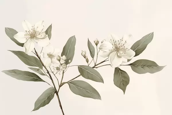 Plakatas Švelni šakelė su baltomis gėlėmis ir žaliais lapais šviesiame fone, su švelniomis detalėmis ir elegantišku stiliumi. f42583