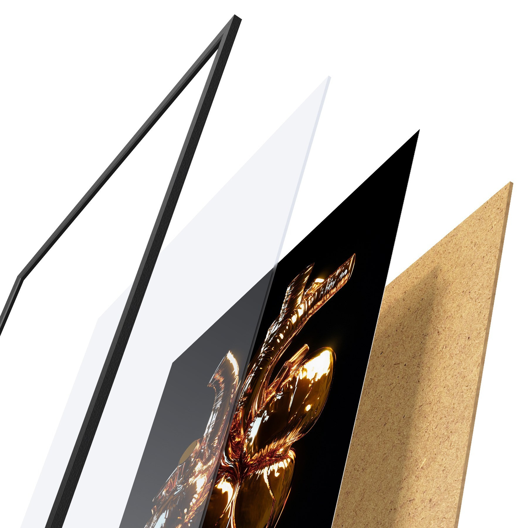 Plakatą sudaro rėmas, pleksiklas, atspausdintas vaizdas ir medžio drožlių plokštės pagrindas. Plakatą galima iš karto pakabinti ant sienos dėl kitoje pusėje esančių laikiklių.