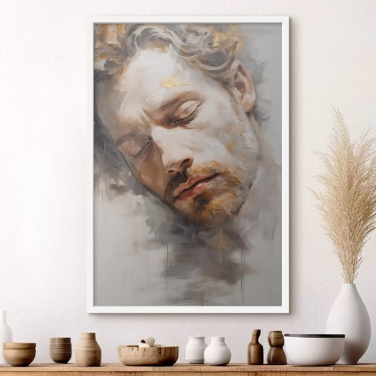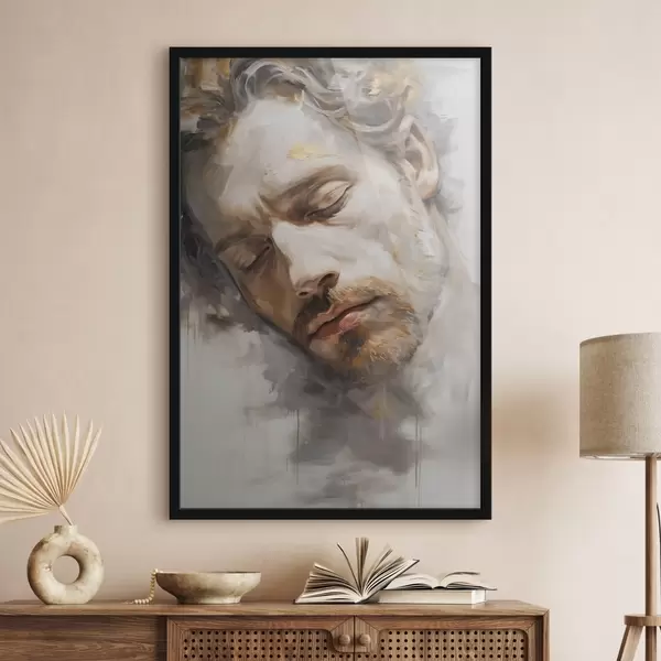 Plakatas Abstraktus vyro užmerktomis akimis portretas, nutapytas švelniais šiltais tonais, švelniais teptuko potėpiais, kurie sukelia ramybės pojūtį. f42621