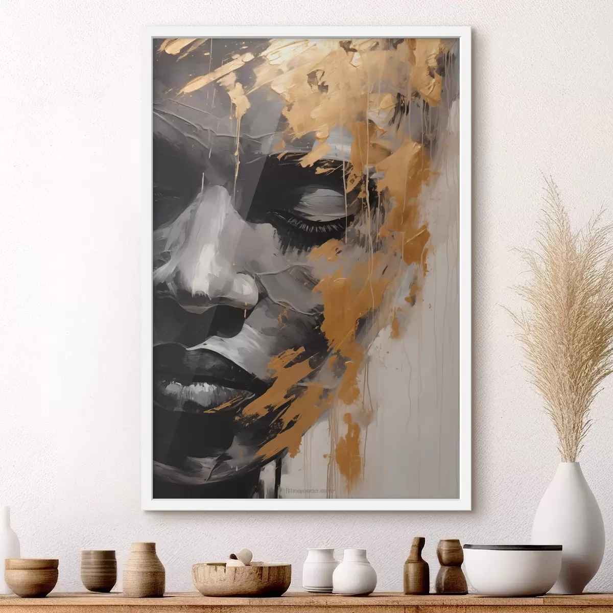 Plakatas Abstraktus moters portretas juodai baltais atspalviais su drąsiais šiltų spalvų potėpiais, kurie suteikia kontrasto ir emocinio gilumo. Ne f42622