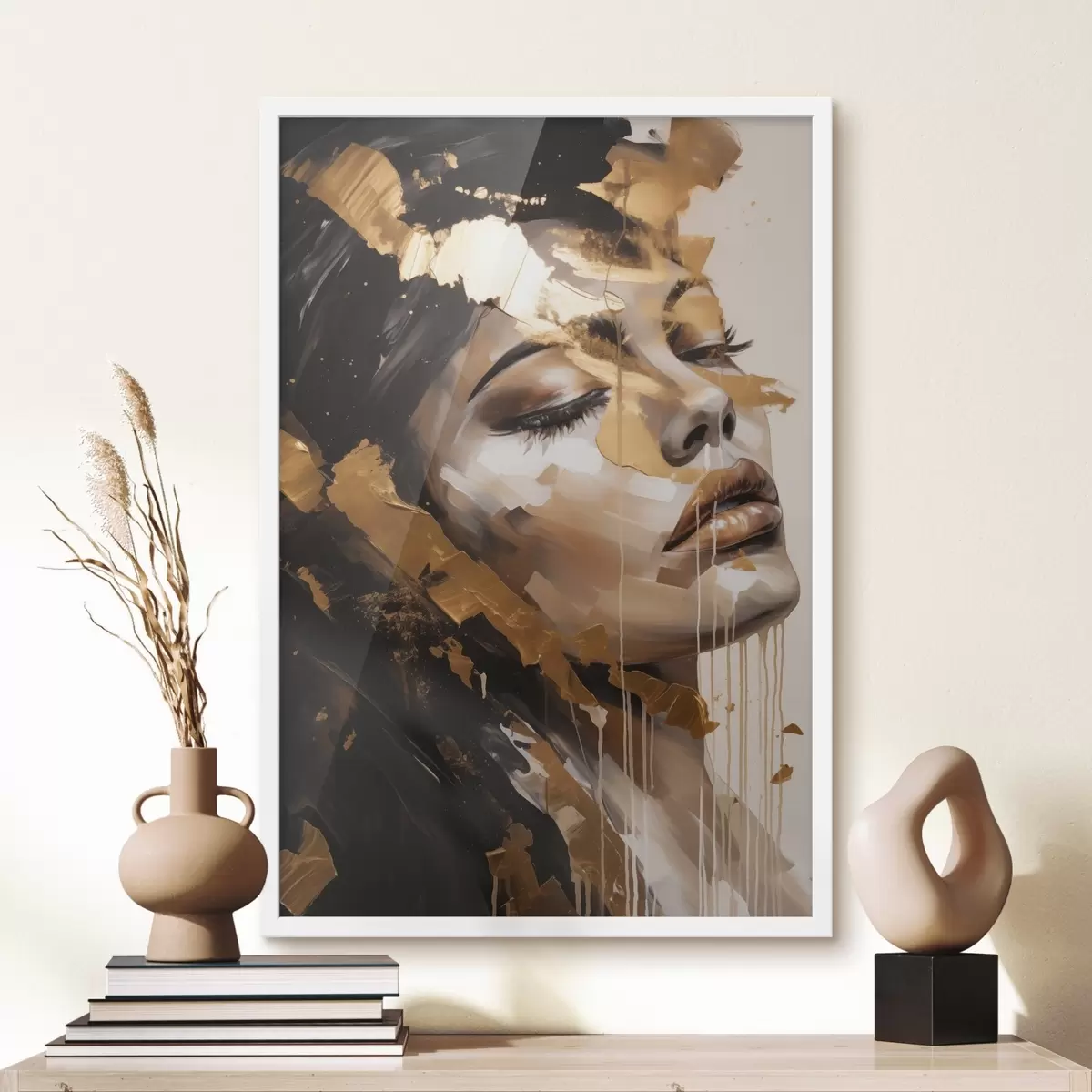 Plakatas Abstraktus švelnios veido išraiškos moters portretas, nutapytas šiltais tonais, dinamiškais teptuko potėpiais, kurie suteikia gilumo ir emocijų. f42627