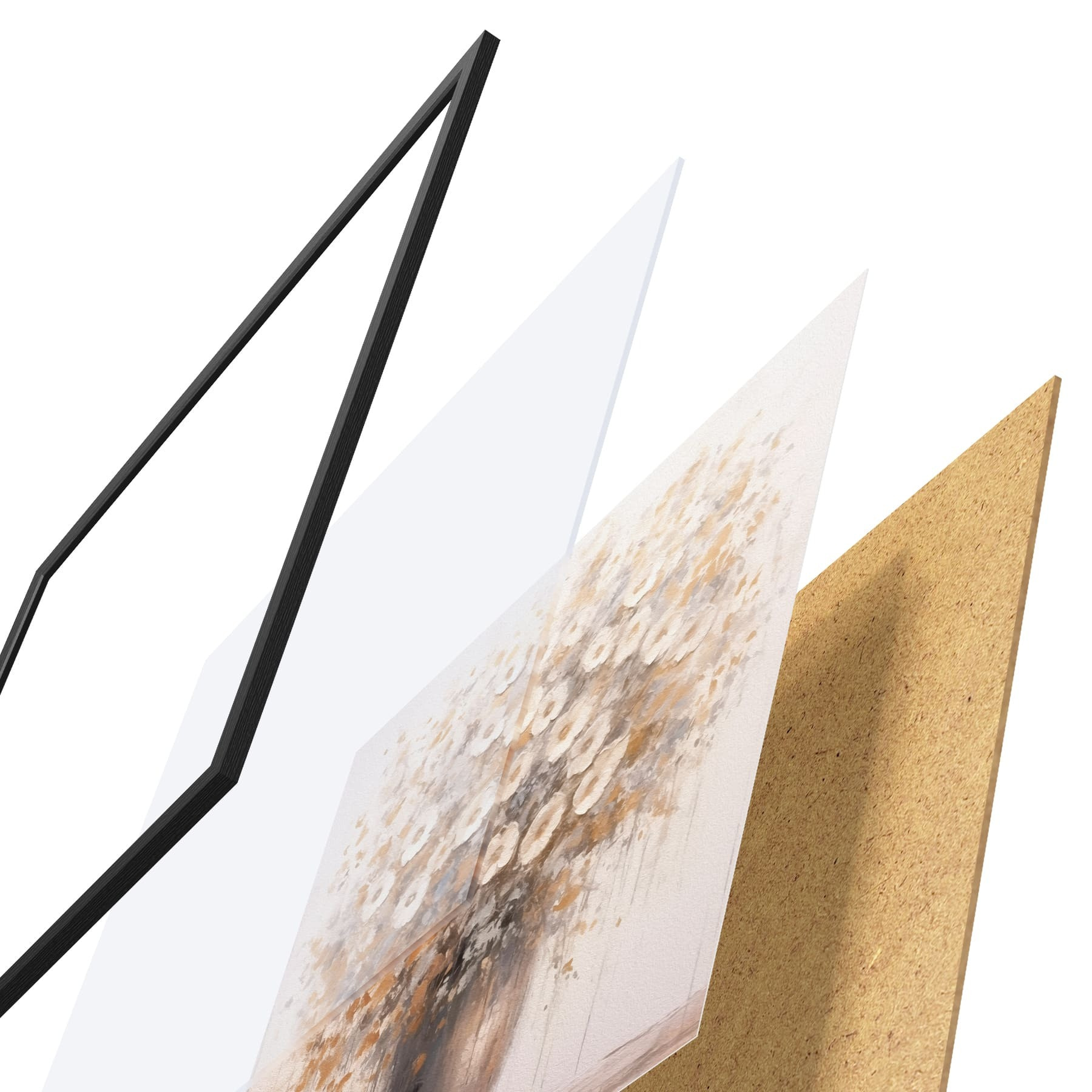 Plakatą sudaro rėmas, pleksiklas, atspausdintas vaizdas ir medžio drožlių plokštės pagrindas. Plakatą galima iš karto pakabinti ant sienos dėl kitoje pusėje esančių laikiklių.