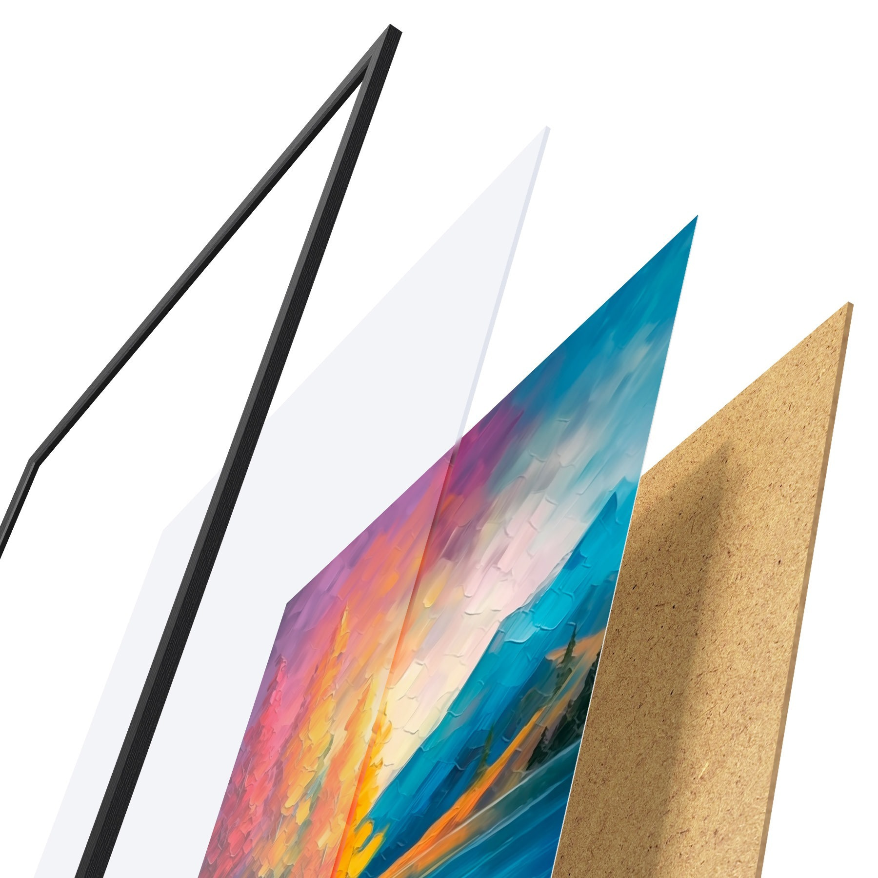Plakatą sudaro rėmas, pleksiklas, atspausdintas vaizdas ir medžio drožlių plokštės pagrindas. Plakatą galima iš karto pakabinti ant sienos dėl kitoje pusėje esančių laikiklių.