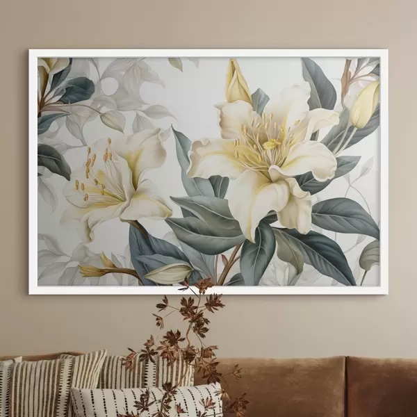 Plakatas Botaninė iliustracija, vaizduojanti baltas ir šviesiai geltonas gėles su įmantriais žiedlapiais, apsuptas žalių lapų f42712
