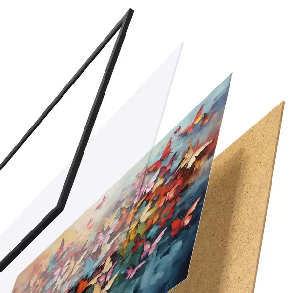 Plakatą sudaro rėmas, pleksiklas, atspausdintas vaizdas ir medžio drožlių plokštės pagrindas. Plakatą galima iš karto pakabinti ant sienos dėl kitoje pusėje esančių laikiklių.
