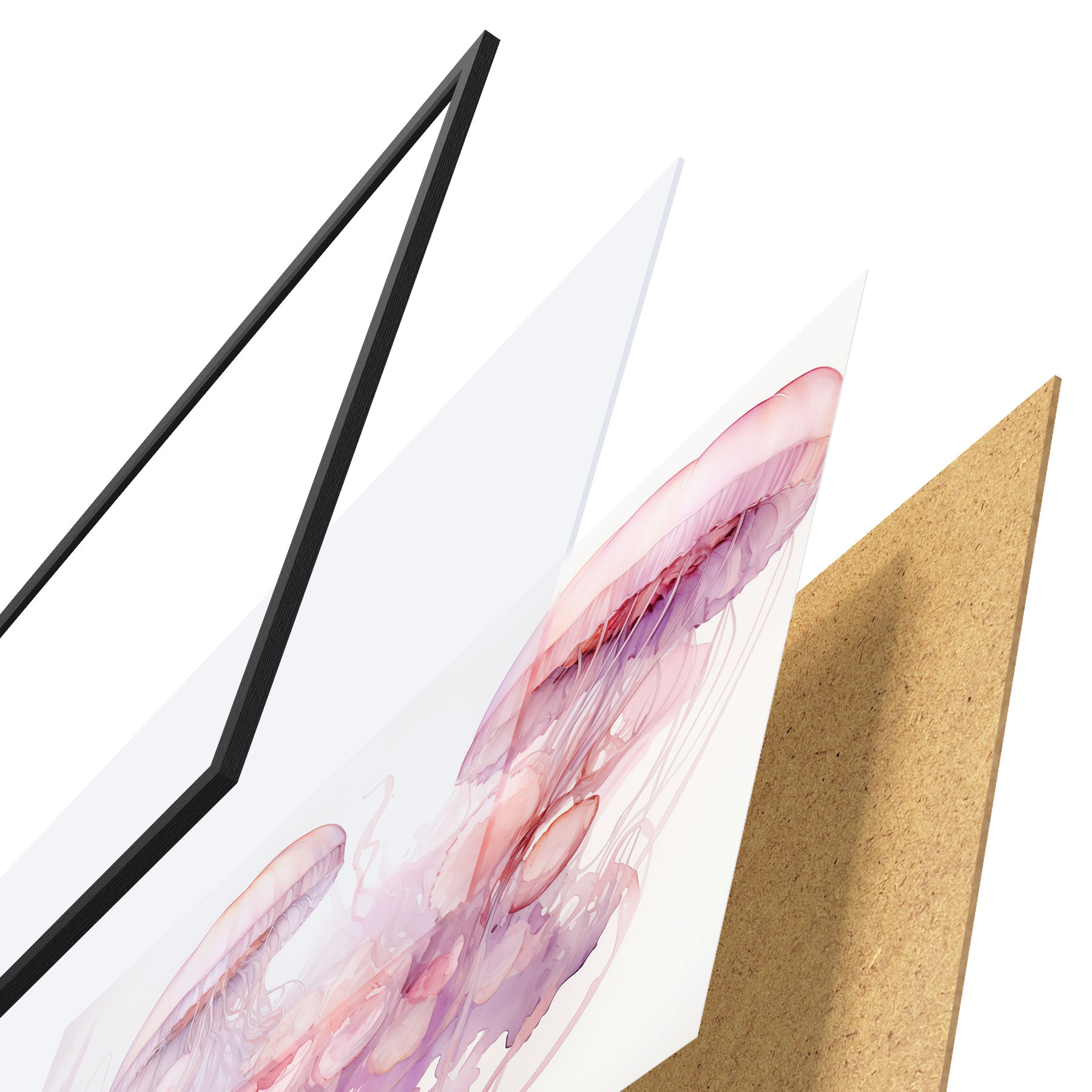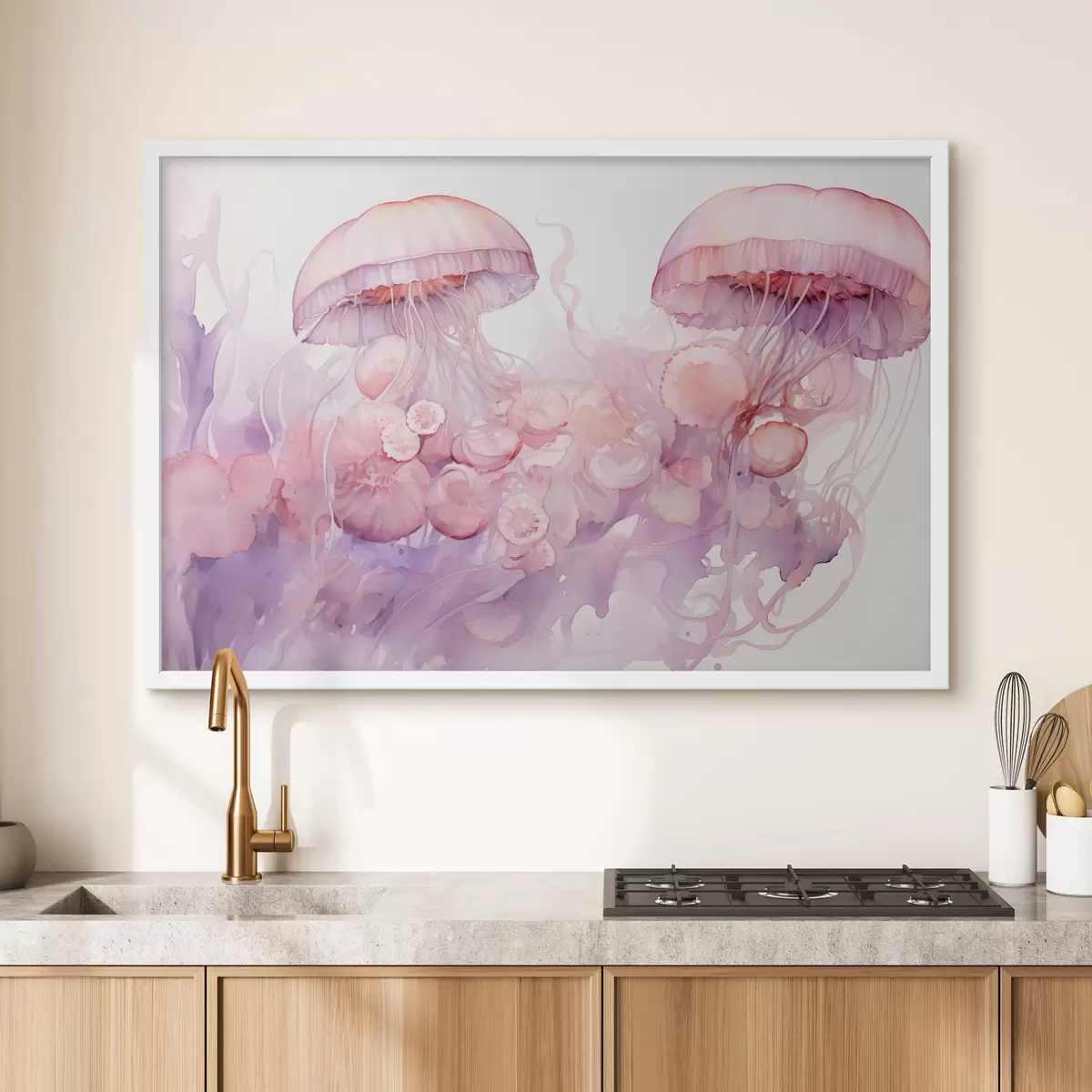 Plakatas Rausvos medūzos, plaukiojančios švelnių rausvų ir violetinių atspalvių sūkuryje, apsuptos abstrakčių formų Ne f42730