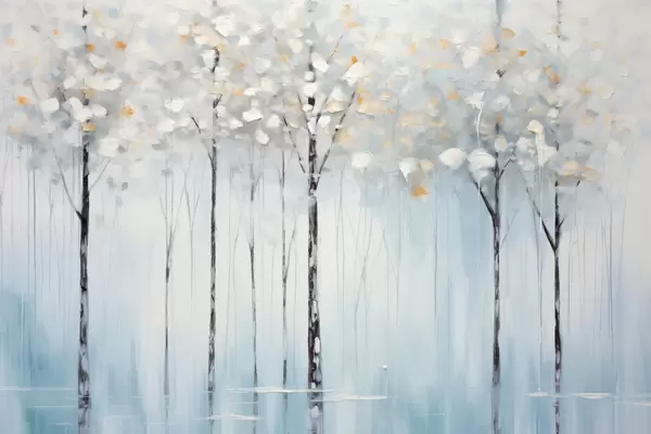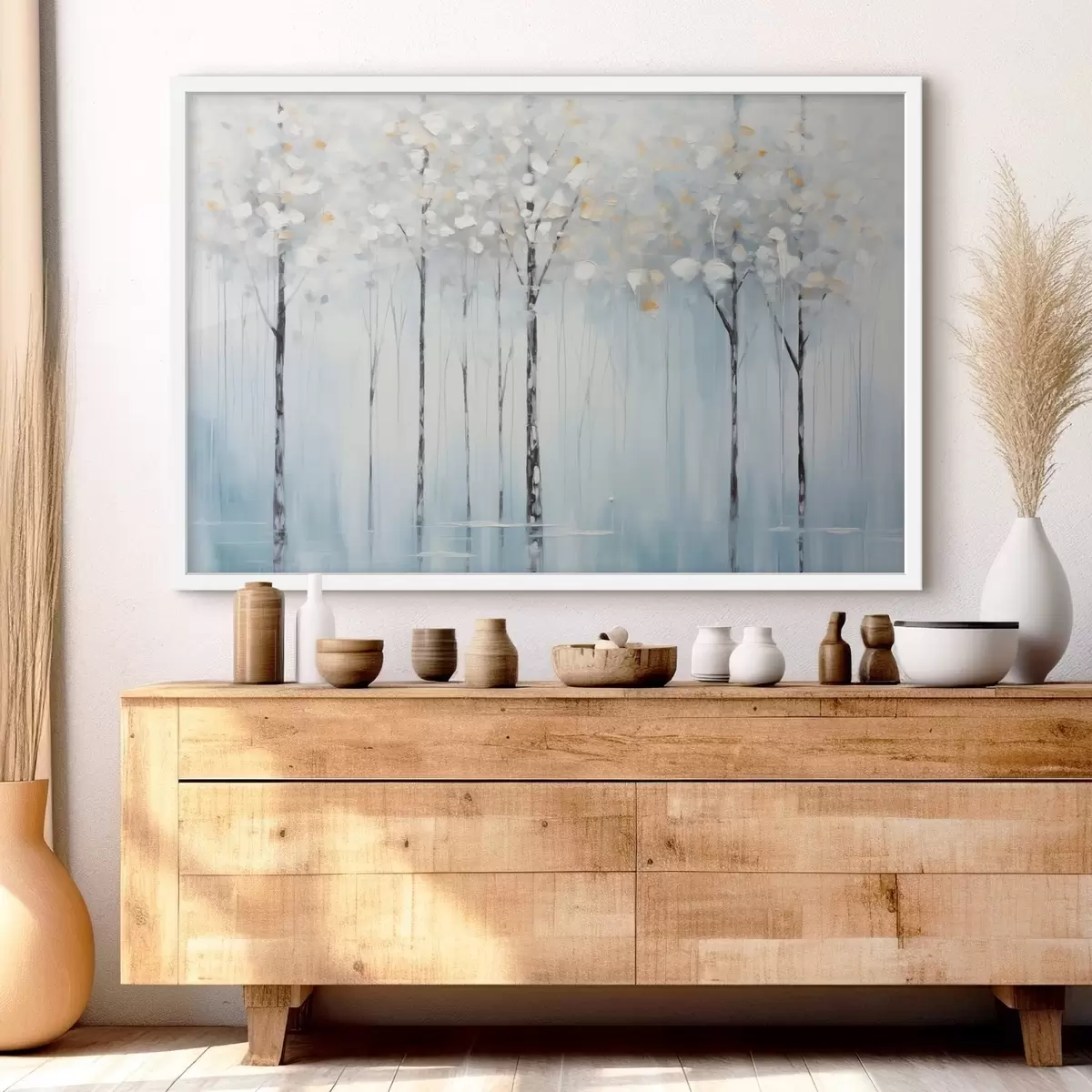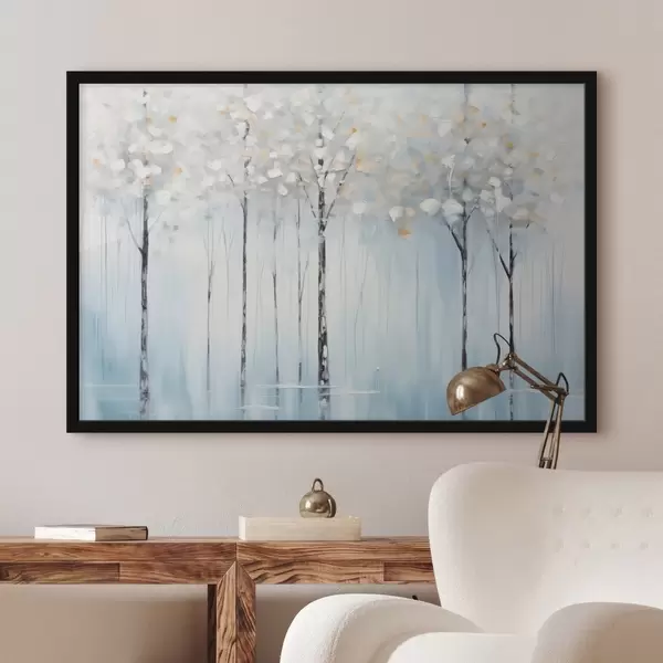 Plakatas Aukšti, liekni medžiai su mėlynais lapais ir geltonais atspalviais švelniai mėlyname fone, aliejinės tapybos imitacija f42731