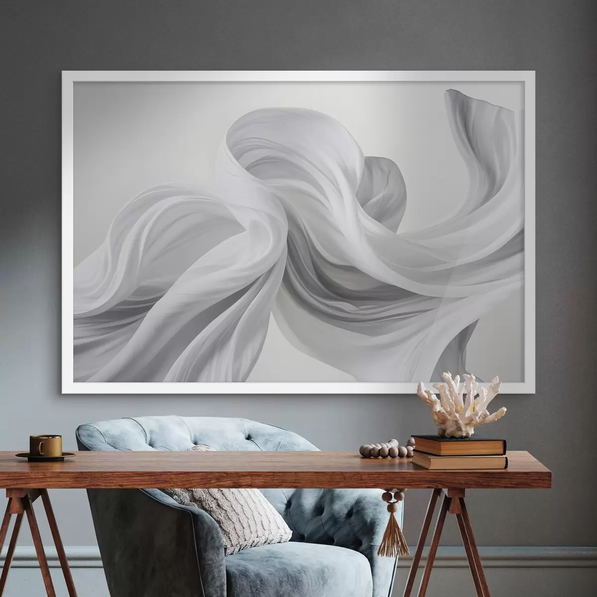 Plakatas Šviesiame fone besisukančios ir susipinančios baltos ir pilkos spalvos audinio formos Ne f42732