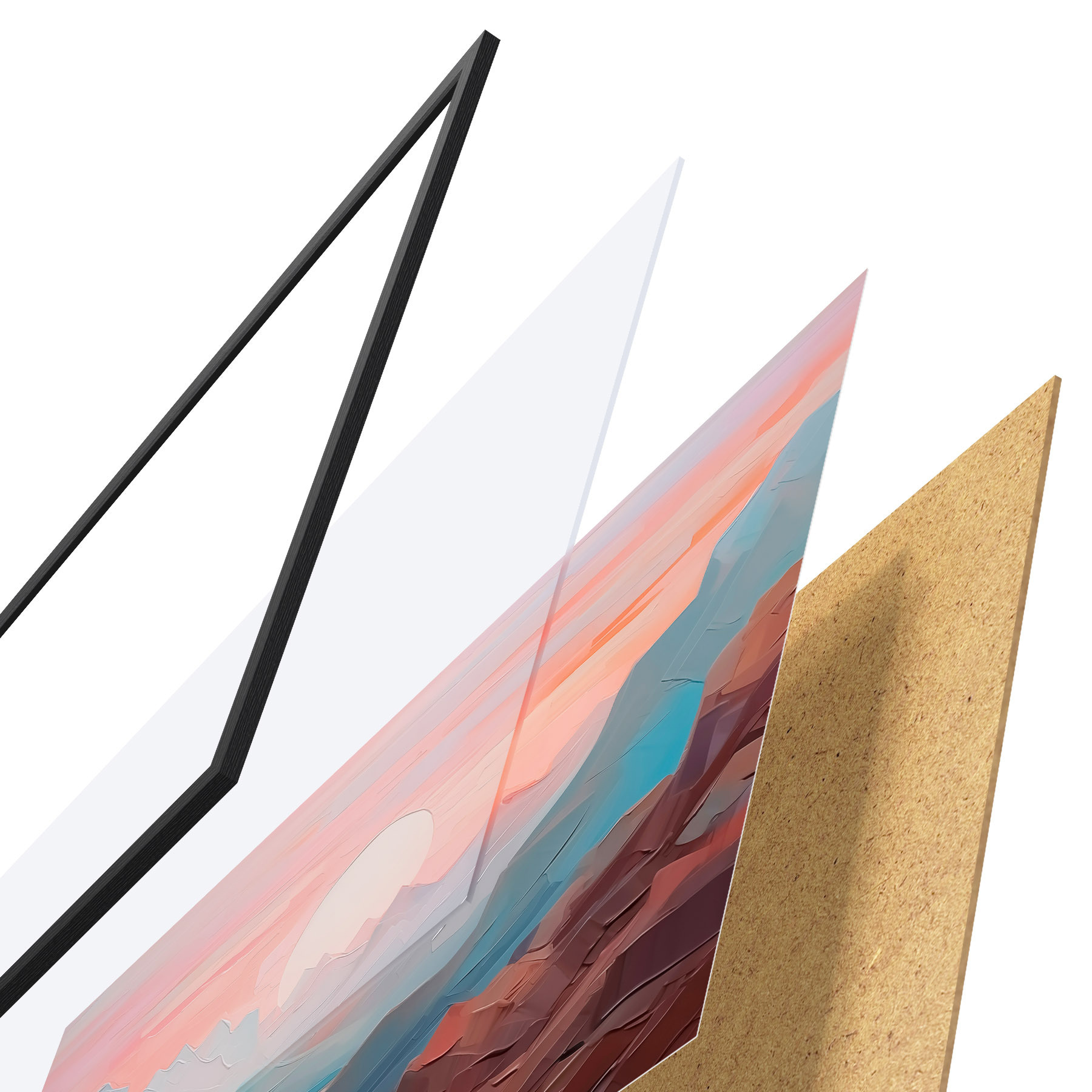 Plakatą sudaro rėmas, pleksiklas, atspausdintas vaizdas ir medžio drožlių plokštės pagrindas. Plakatą galima iš karto pakabinti ant sienos dėl kitoje pusėje esančių laikiklių.