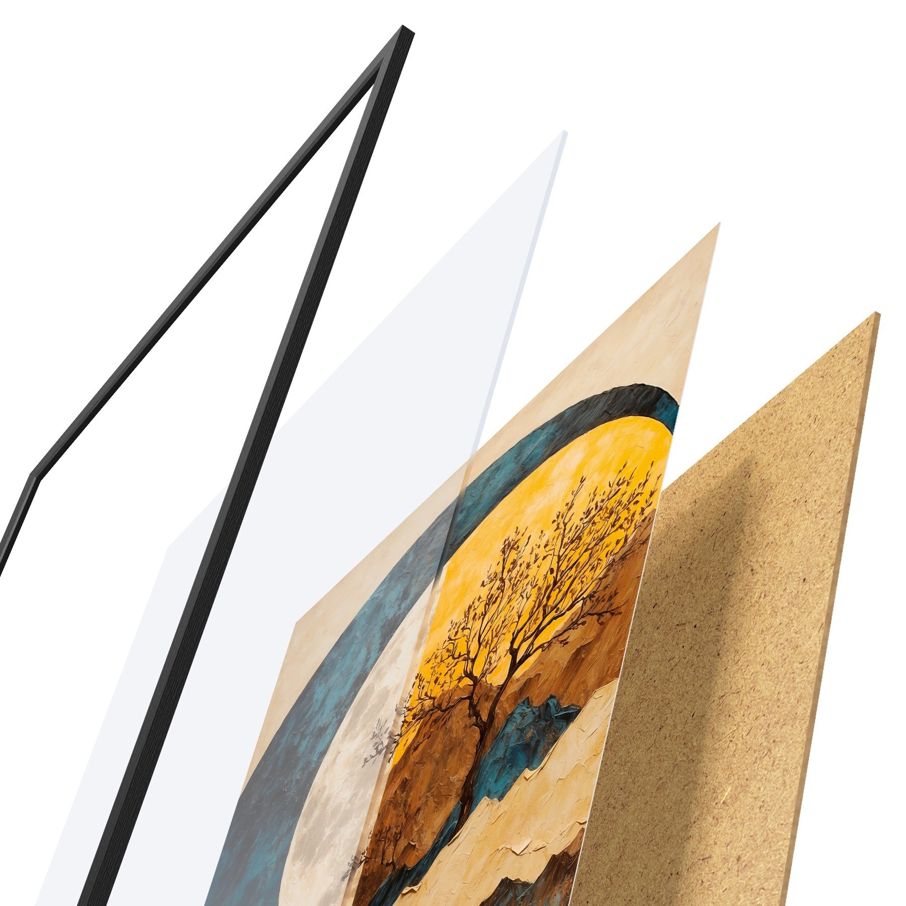 Plakatą sudaro rėmas, pleksiklas, atspausdintas vaizdas ir medžio drožlių plokštės pagrindas. Plakatą galima iš karto pakabinti ant sienos dėl kitoje pusėje esančių laikiklių.