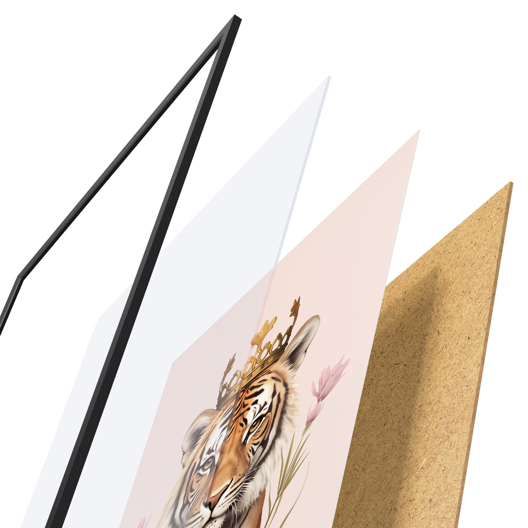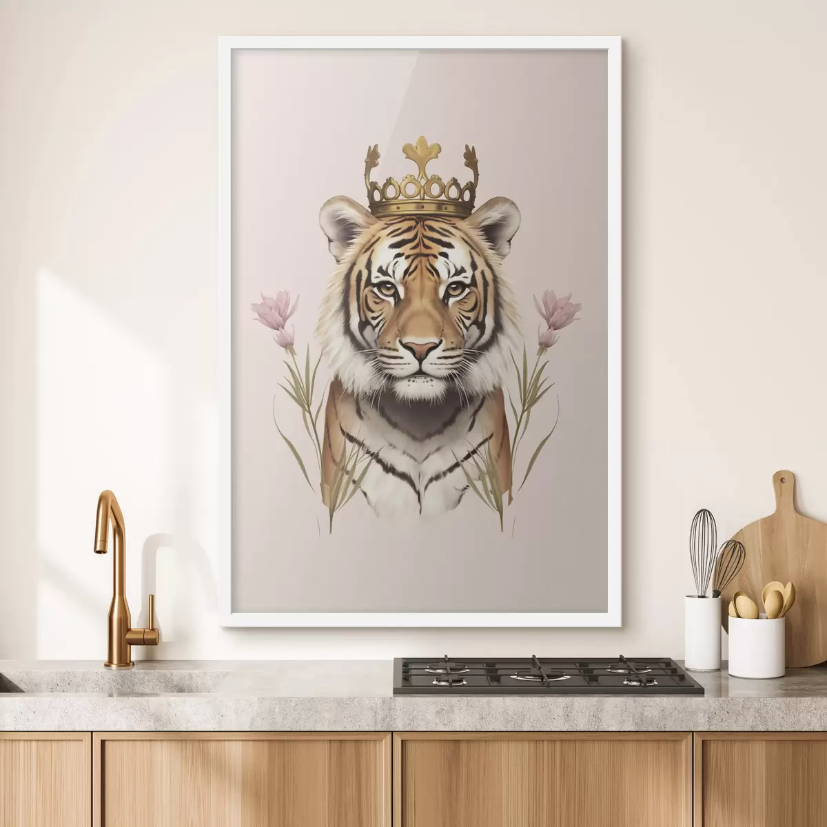 Plakatas Tigras su auksine karūna, rožinis fonas, tulpių žiedai Ne f42782