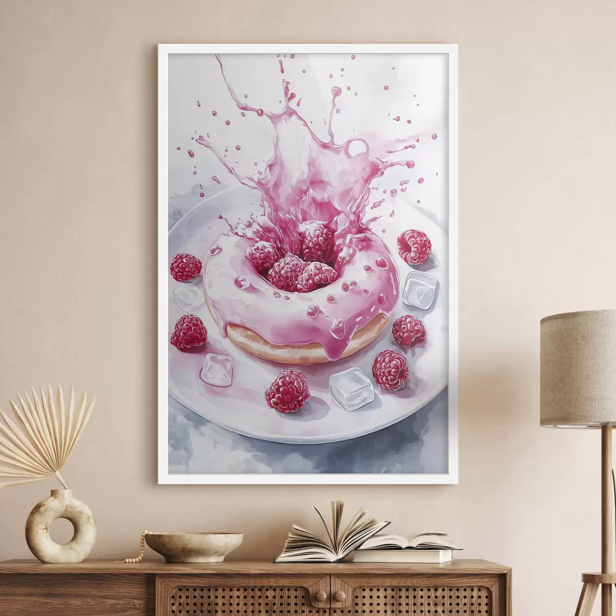 Plakatas Skanus keksas lėkštėje, putojantis kremas, avietės, ledas f42788