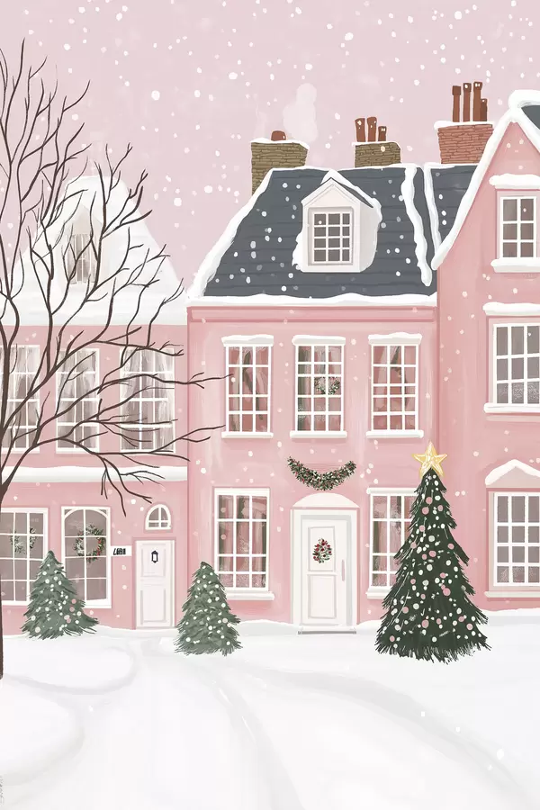 Plakatas Mieli rožiniai namai, pušys, žiemos peizažai f42791