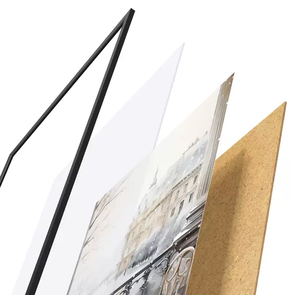 Plakatą sudaro rėmas, pleksiklas, atspausdintas vaizdas ir medžio drožlių plokštės pagrindas. Plakatą galima iš karto pakabinti ant sienos dėl kitoje pusėje esančių laikiklių.
