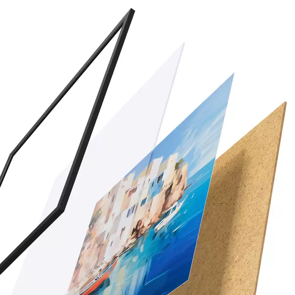 Plakatą sudaro rėmas, pleksiklas, atspausdintas vaizdas ir medžio drožlių plokštės pagrindas. Plakatą galima iš karto pakabinti ant sienos dėl kitoje pusėje esančių laikiklių.