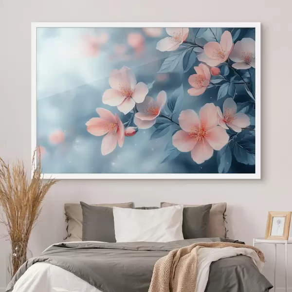 Plakatas Rožinės gėlės mėlyname fone f42846