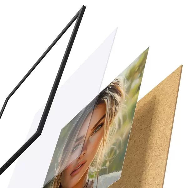 Plakatą sudaro rėmas, pleksiklas, atspausdintas vaizdas ir medžio drožlių plokštės pagrindas. Plakatą galima iš karto pakabinti ant sienos dėl kitoje pusėje esančių laikiklių.
