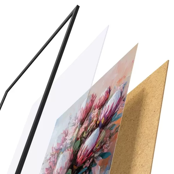 Plakatą sudaro rėmas, pleksiklas, atspausdintas vaizdas ir medžio drožlių plokštės pagrindas. Plakatą galima iš karto pakabinti ant sienos dėl kitoje pusėje esančių laikiklių.