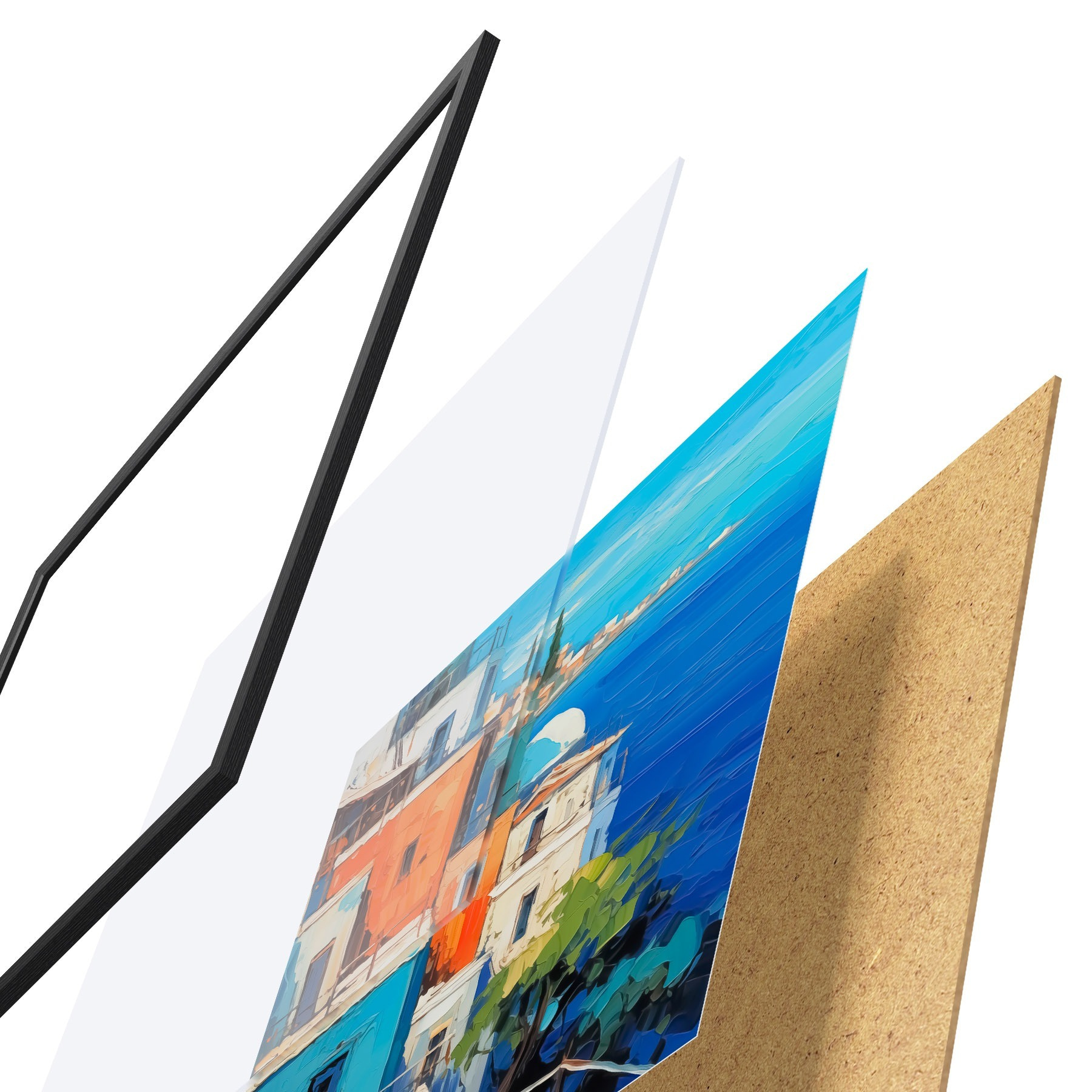 Plakatą sudaro rėmas, pleksiklas, atspausdintas vaizdas ir medžio drožlių plokštės pagrindas. Plakatą galima iš karto pakabinti ant sienos dėl kitoje pusėje esančių laikiklių.