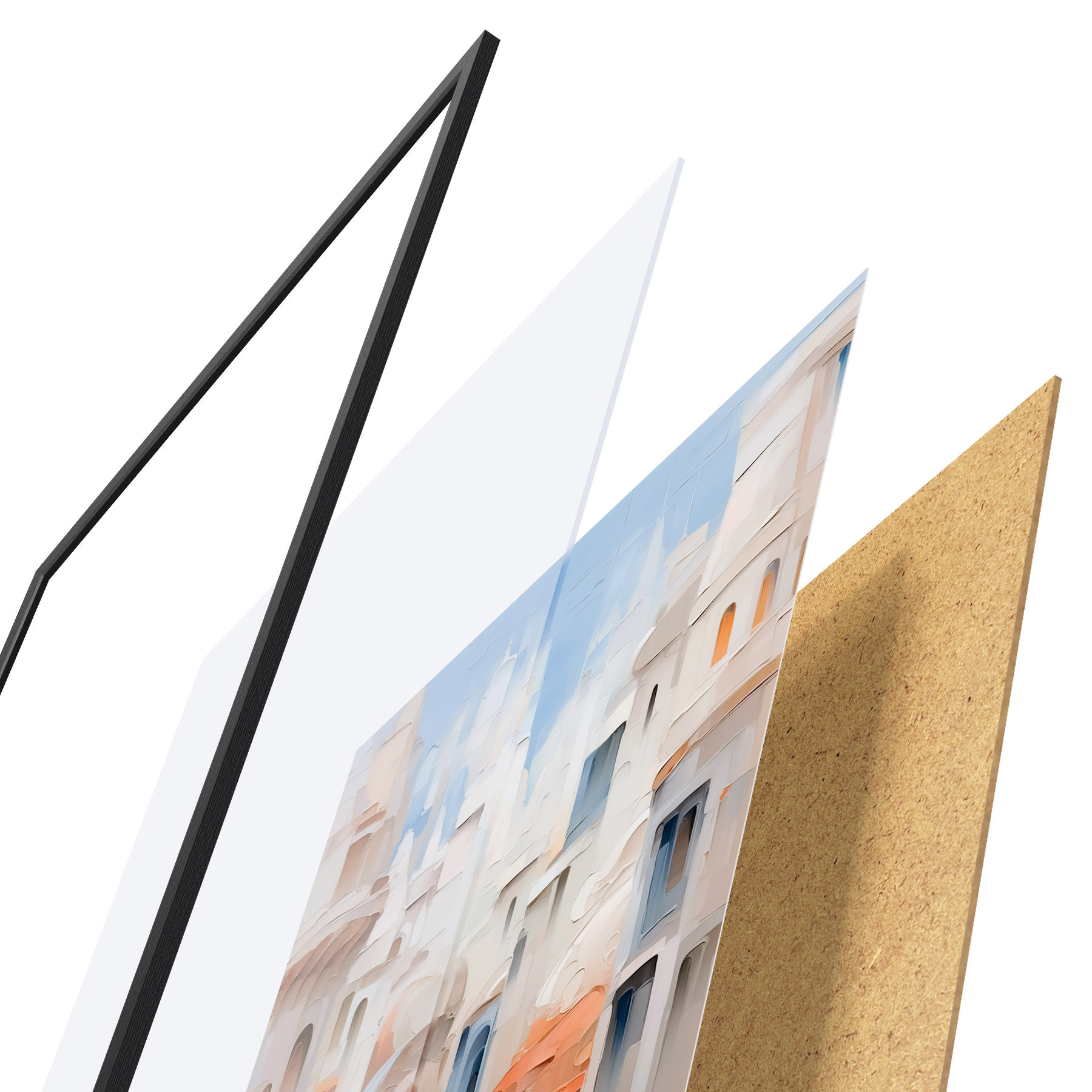 Plakatą sudaro rėmas, pleksiklas, atspausdintas vaizdas ir medžio drožlių plokštės pagrindas. Plakatą galima iš karto pakabinti ant sienos dėl kitoje pusėje esančių laikiklių.