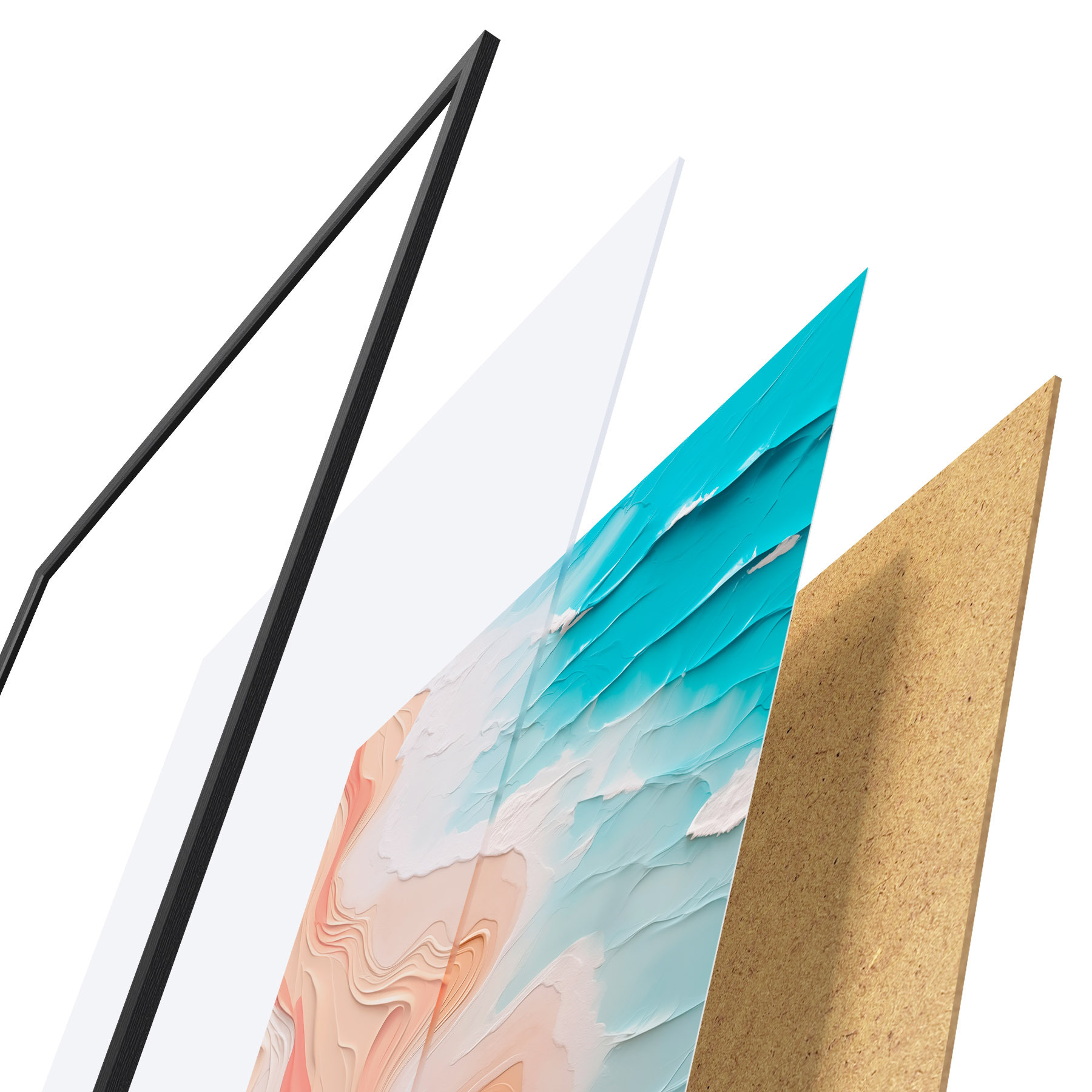 Plakatą sudaro rėmas, pleksiklas, atspausdintas vaizdas ir medžio drožlių plokštės pagrindas. Plakatą galima iš karto pakabinti ant sienos dėl kitoje pusėje esančių laikiklių.