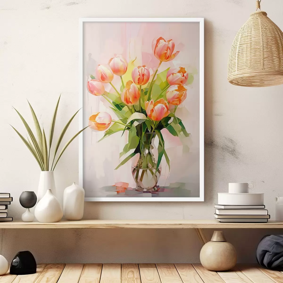 Plakatas Tapytoji natiurmortas su tulpėmis stiklinėje vazoje šviesiame fone f42940