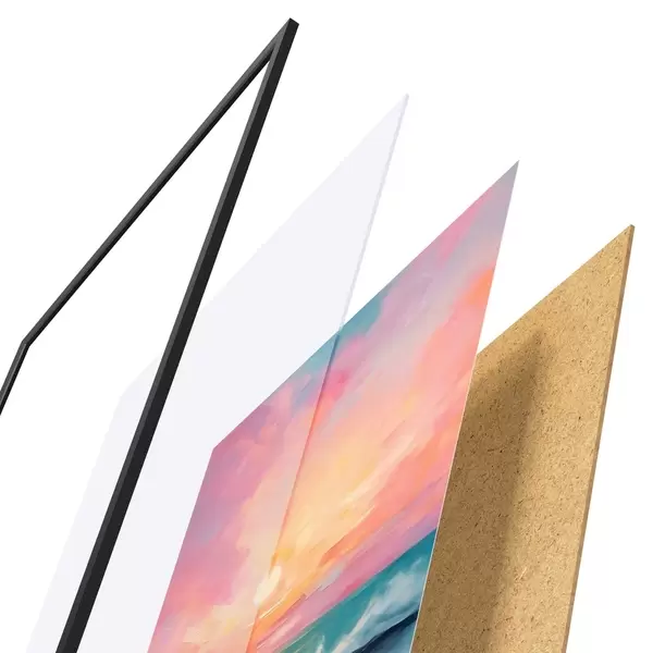 Plakatą sudaro rėmas, pleksiklas, atspausdintas vaizdas ir medžio drožlių plokštės pagrindas. Plakatą galima iš karto pakabinti ant sienos dėl kitoje pusėje esančių laikiklių.