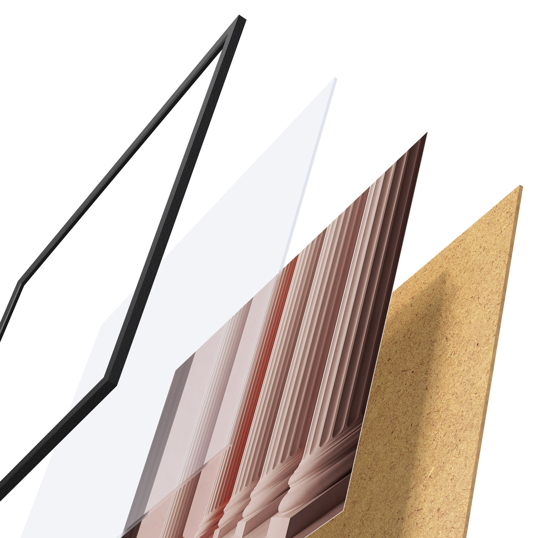 Plakatą sudaro rėmas, pleksiklas, atspausdintas vaizdas ir medžio drožlių plokštės pagrindas. Plakatą galima iš karto pakabinti ant sienos dėl kitoje pusėje esančių laikiklių.