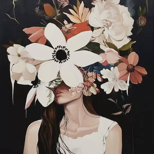 Plakatas Mergaitė su gėlėmis ant veido f42989