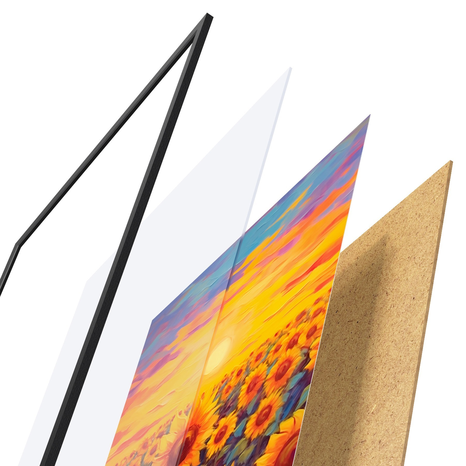 Plakatą sudaro rėmas, pleksiklas, atspausdintas vaizdas ir medžio drožlių plokštės pagrindas. Plakatą galima iš karto pakabinti ant sienos dėl kitoje pusėje esančių laikiklių.