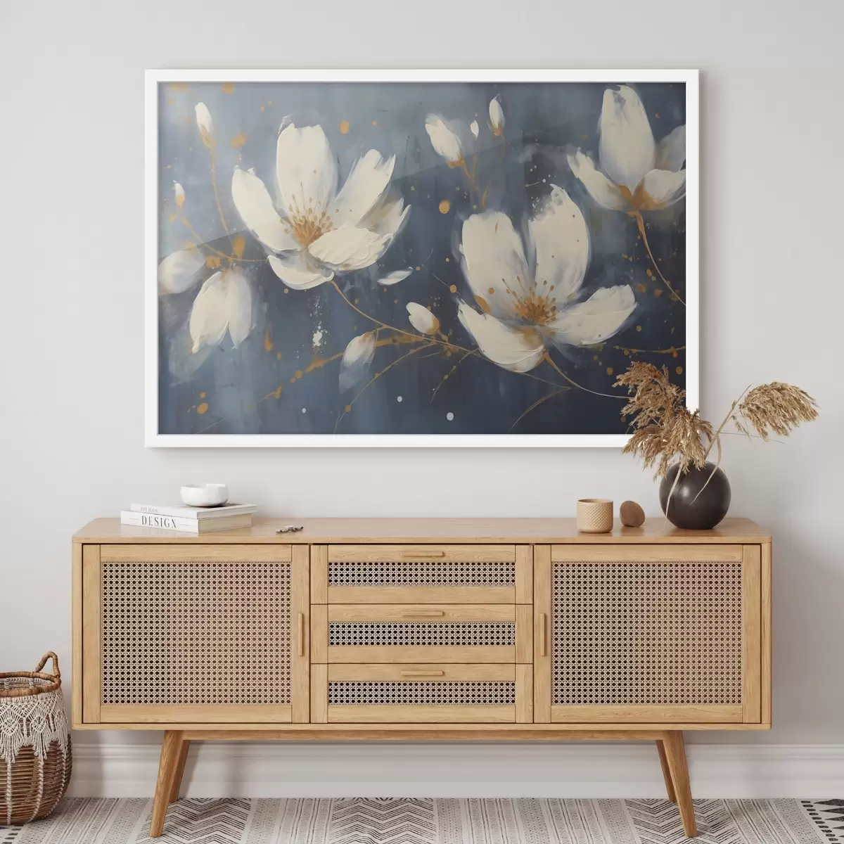 Plakatas Baltos gėlės mėlyname fone Ne f43025