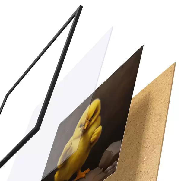 Plakatą sudaro rėmas, pleksiklas, atspausdintas vaizdas ir medžio drožlių plokštės pagrindas. Plakatą galima iš karto pakabinti ant sienos dėl kitoje pusėje esančių laikiklių.