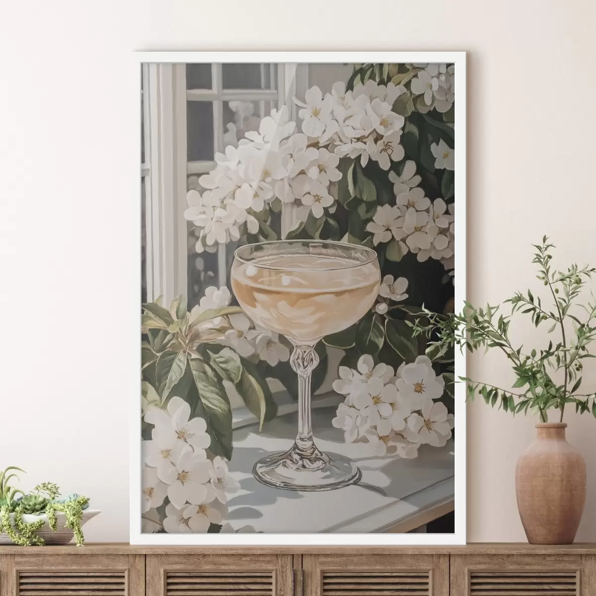Plakatas Taurė šampano, vintažinis, akvarelės stilius, baltos gėlės f43051