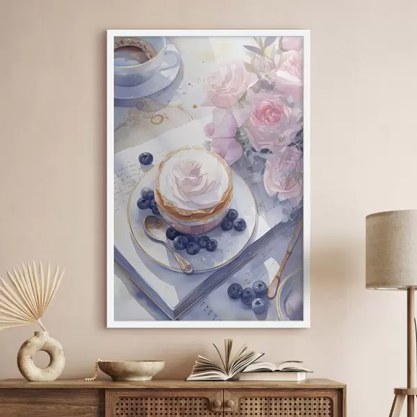 Plakatas Mėlynių keksas, boho stilius, akvarelė, rožinės rožės, poetiškas Ne f43053