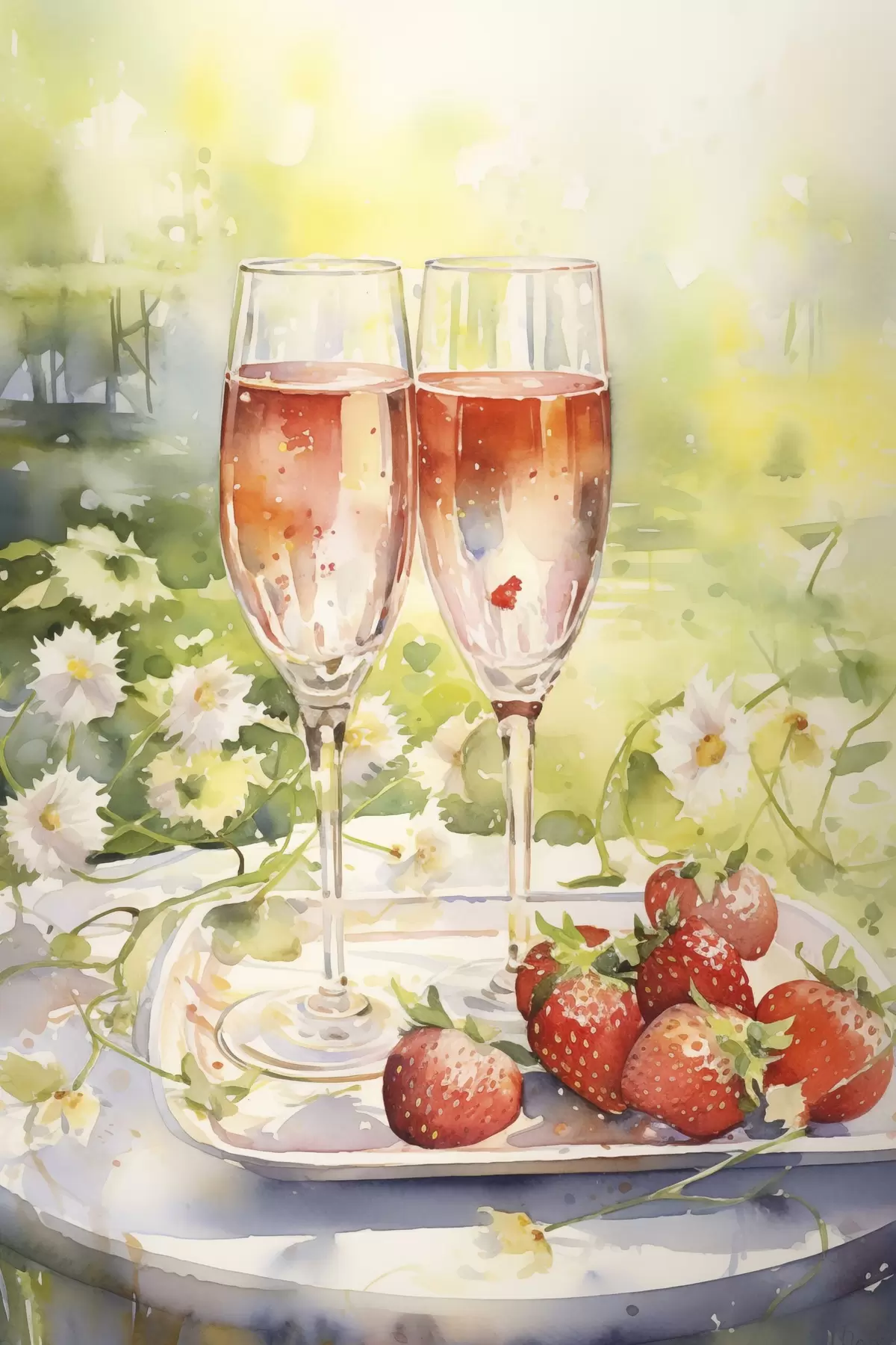 Plakatas Akvarelės stiliaus piešinys su šampano taurėmis, gėlėmis ir braškėmis Ne f43056