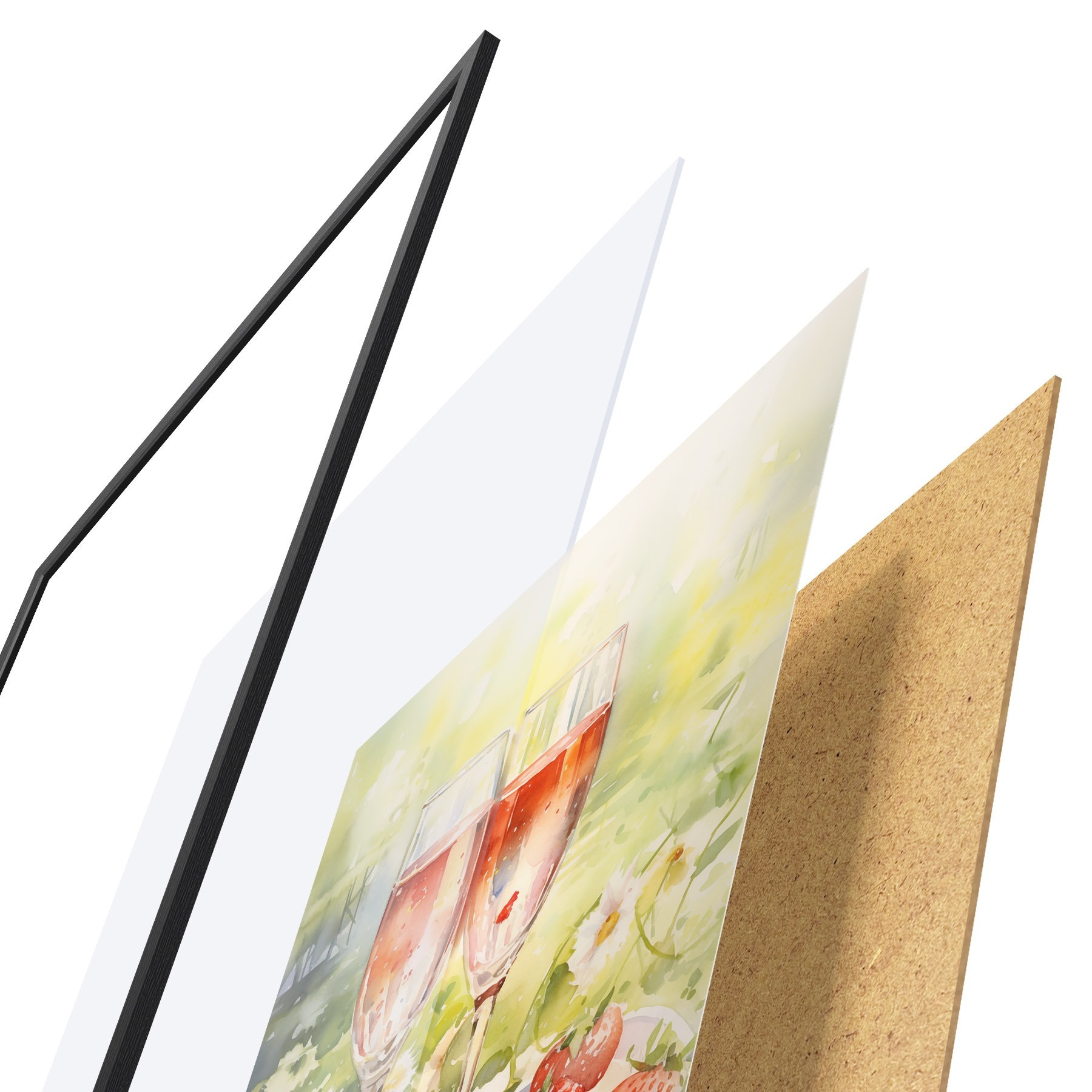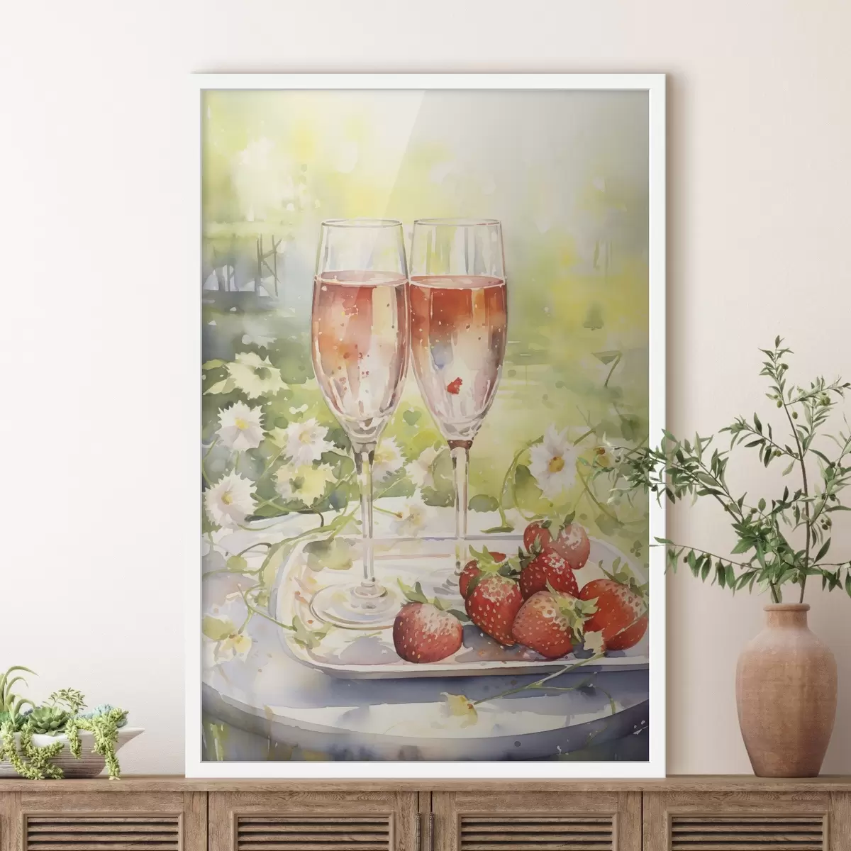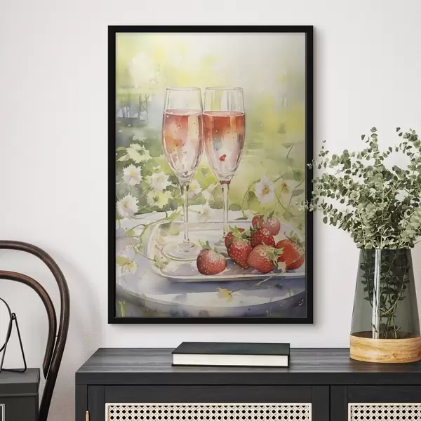 Plakatas Akvarelės stiliaus piešinys su šampano taurėmis, gėlėmis ir braškėmis f43056
