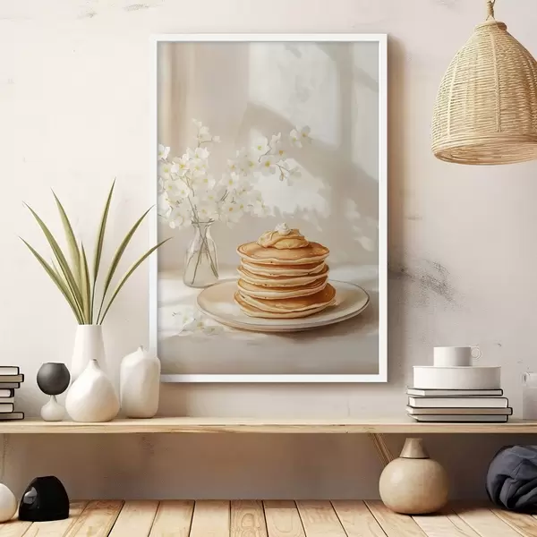 Plakatas Skanūs blyneliai su žemės riešutų sviestu, akvarelės stilius, vaza su baltomis gėlėmis Ne f43063