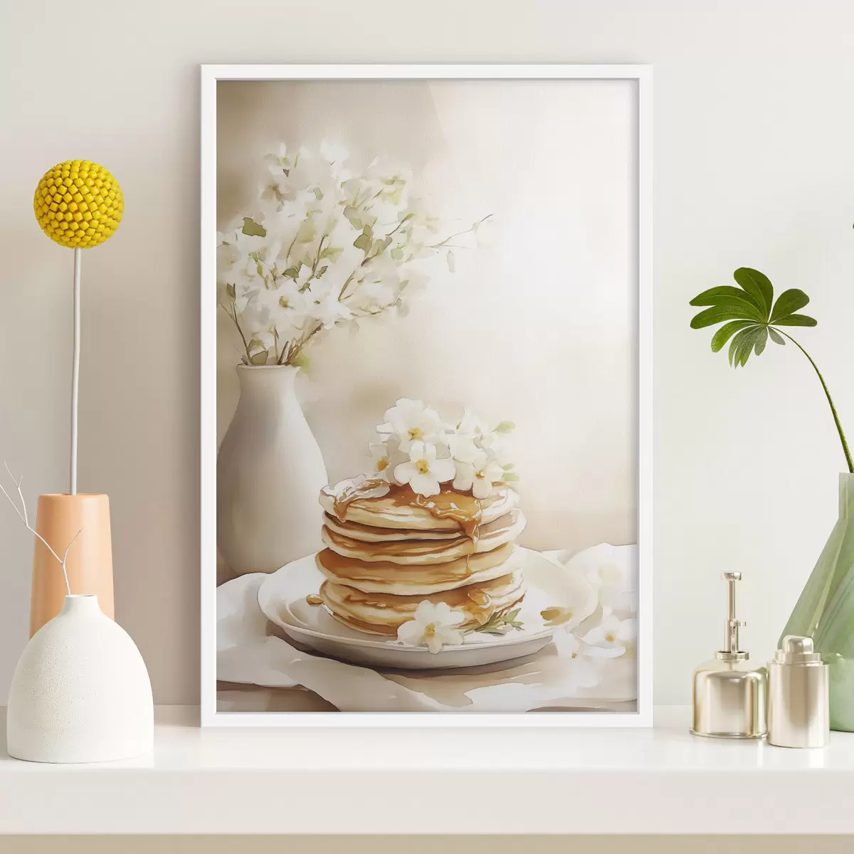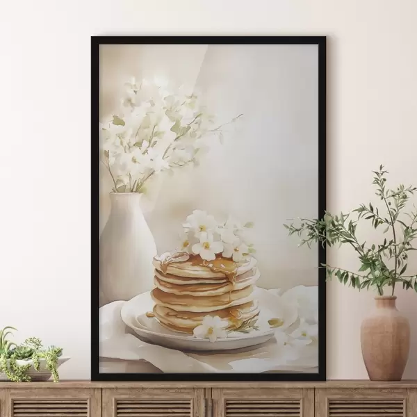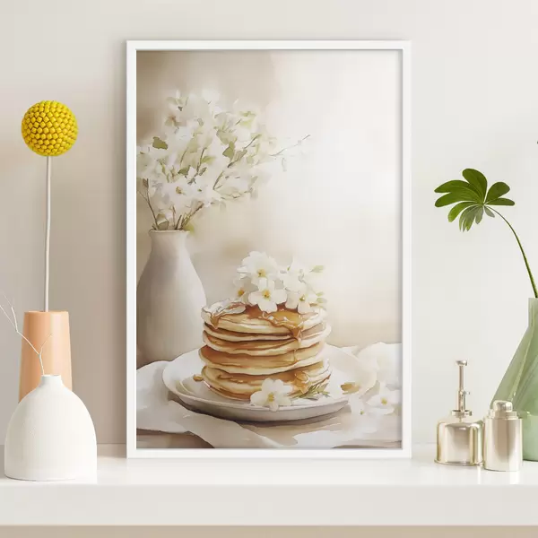 Plakatas Blyneliai su žemės riešutų sviestu, baltos gėlės, akvarelės stiliaus piešinys Ne f43065