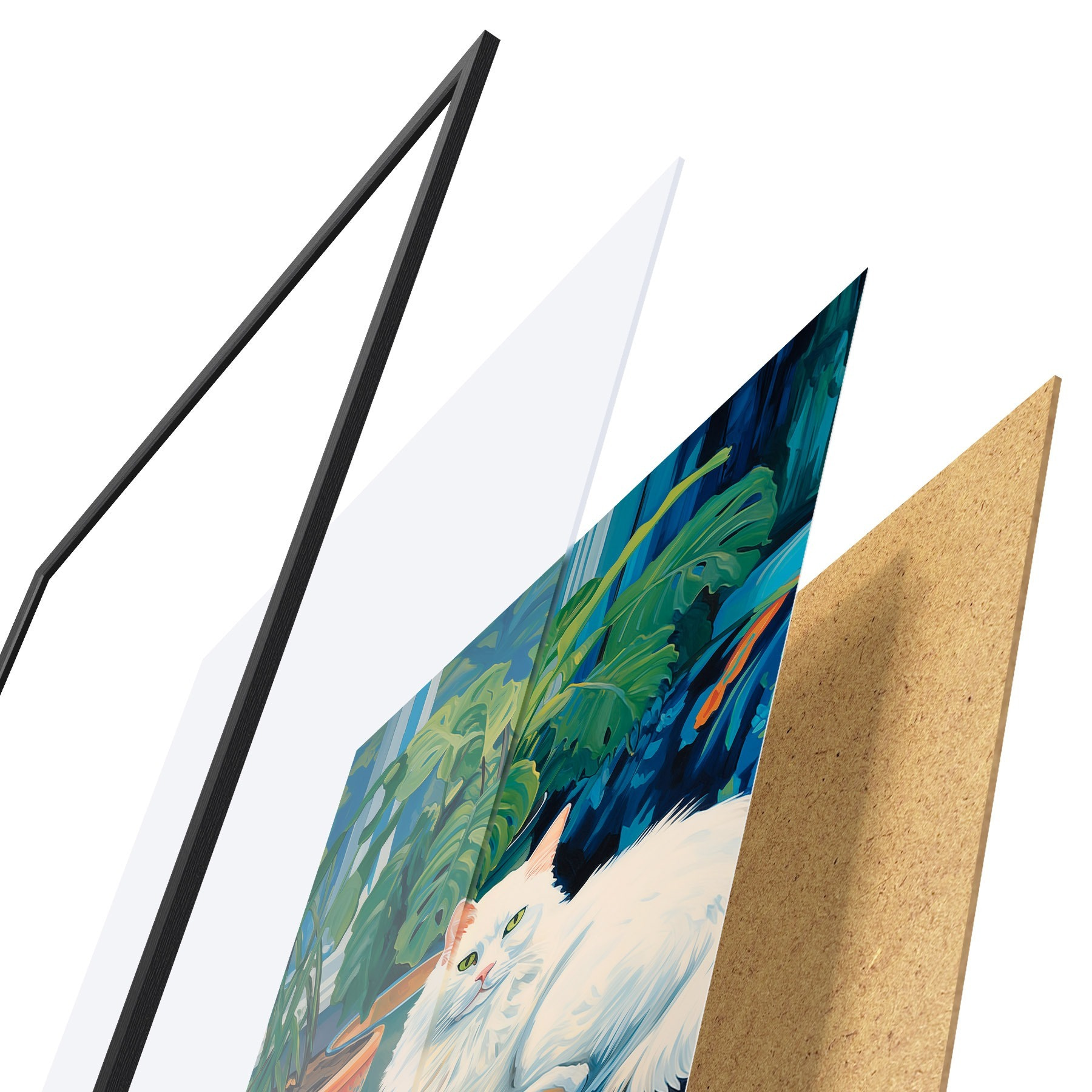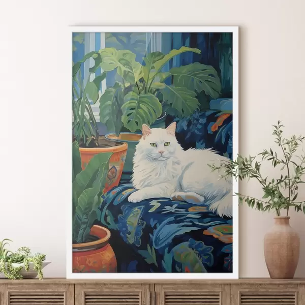 Plakatas Balta katė tarp vešlios žalumos ir keraminių vazonų f43131