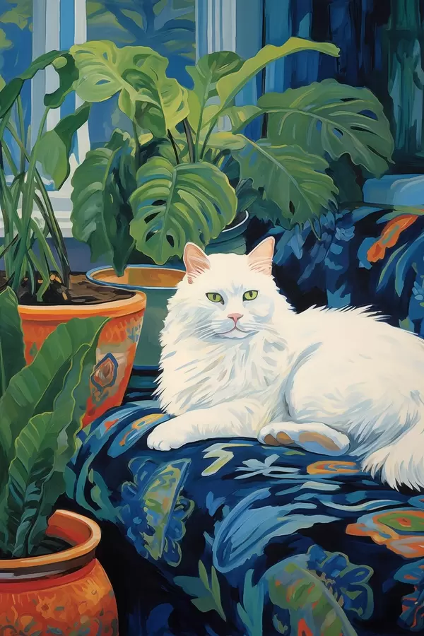 Plakatas Balta katė tarp vešlios žalumos ir keraminių vazonų f43131