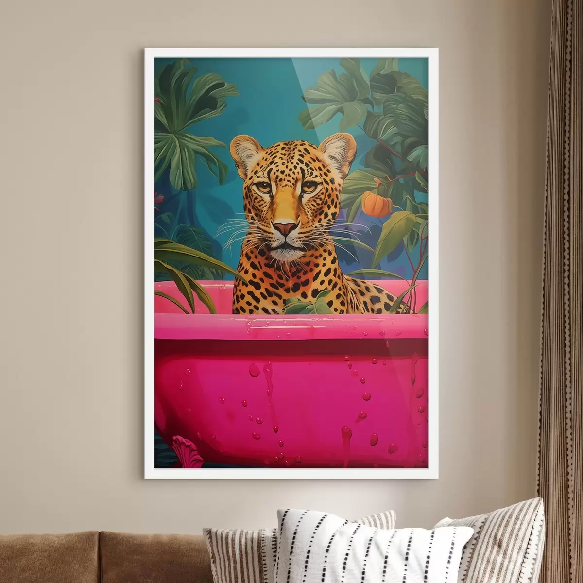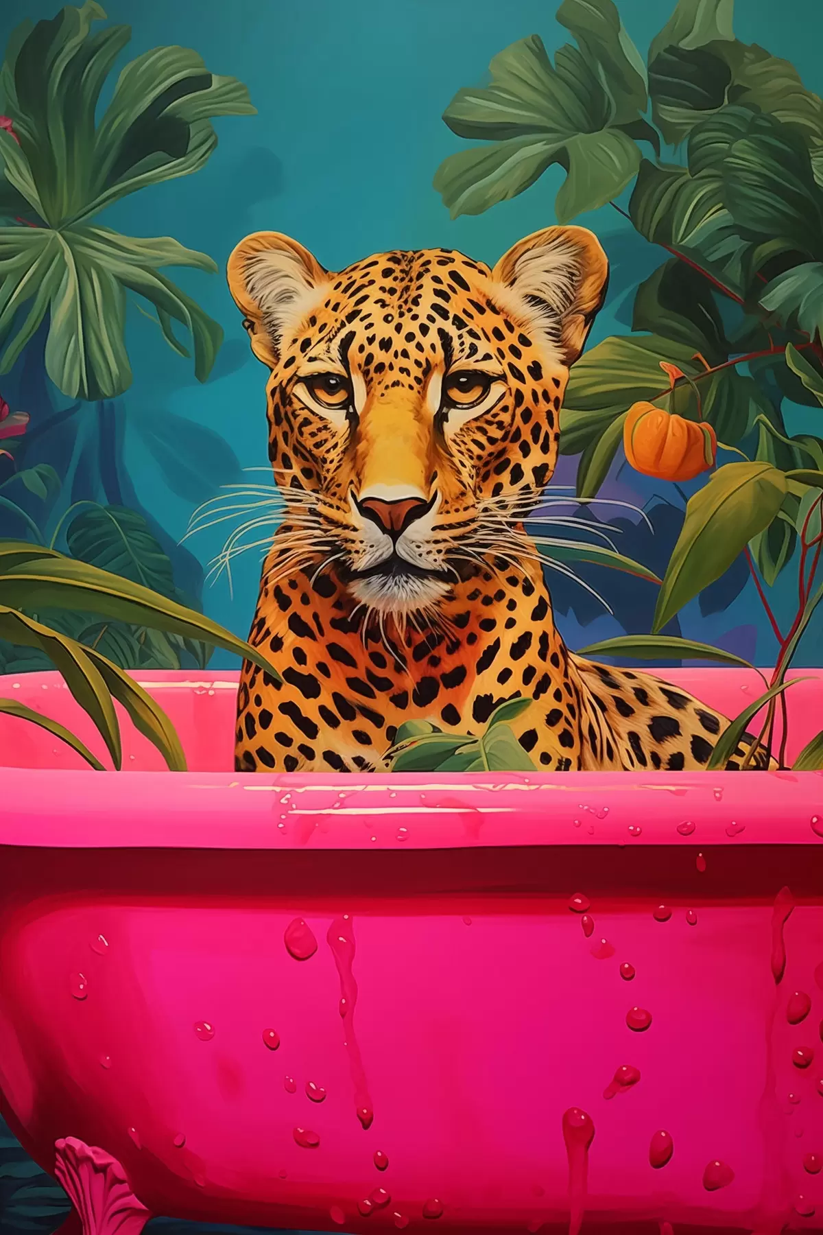 Plakatas Leopardas rausvoje vonioje tarp egzotiškų augalų Ne f43135