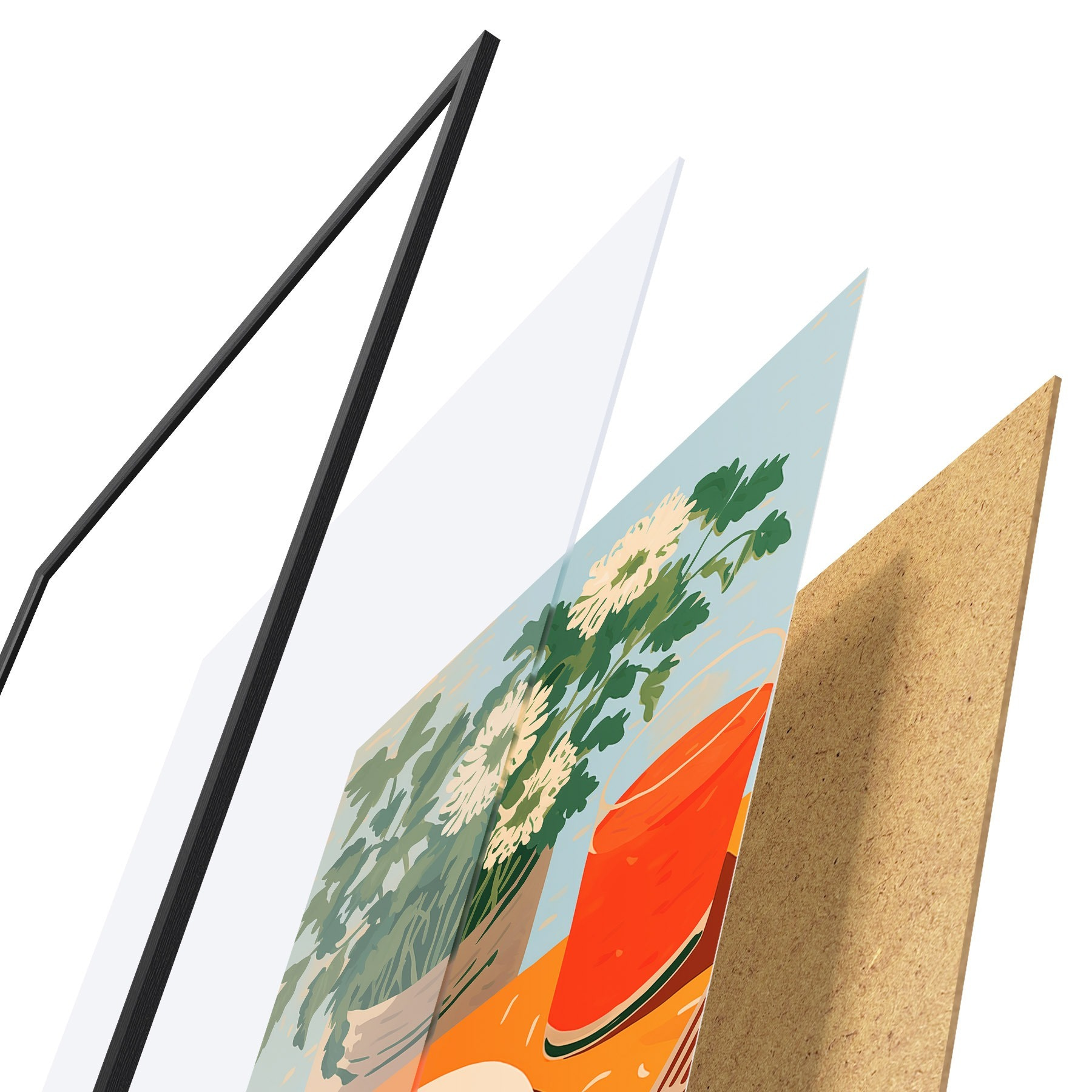 Plakatą sudaro rėmas, pleksiklas, atspausdintas vaizdas ir medžio drožlių plokštės pagrindas. Plakatą galima iš karto pakabinti ant sienos dėl kitoje pusėje esančių laikiklių.